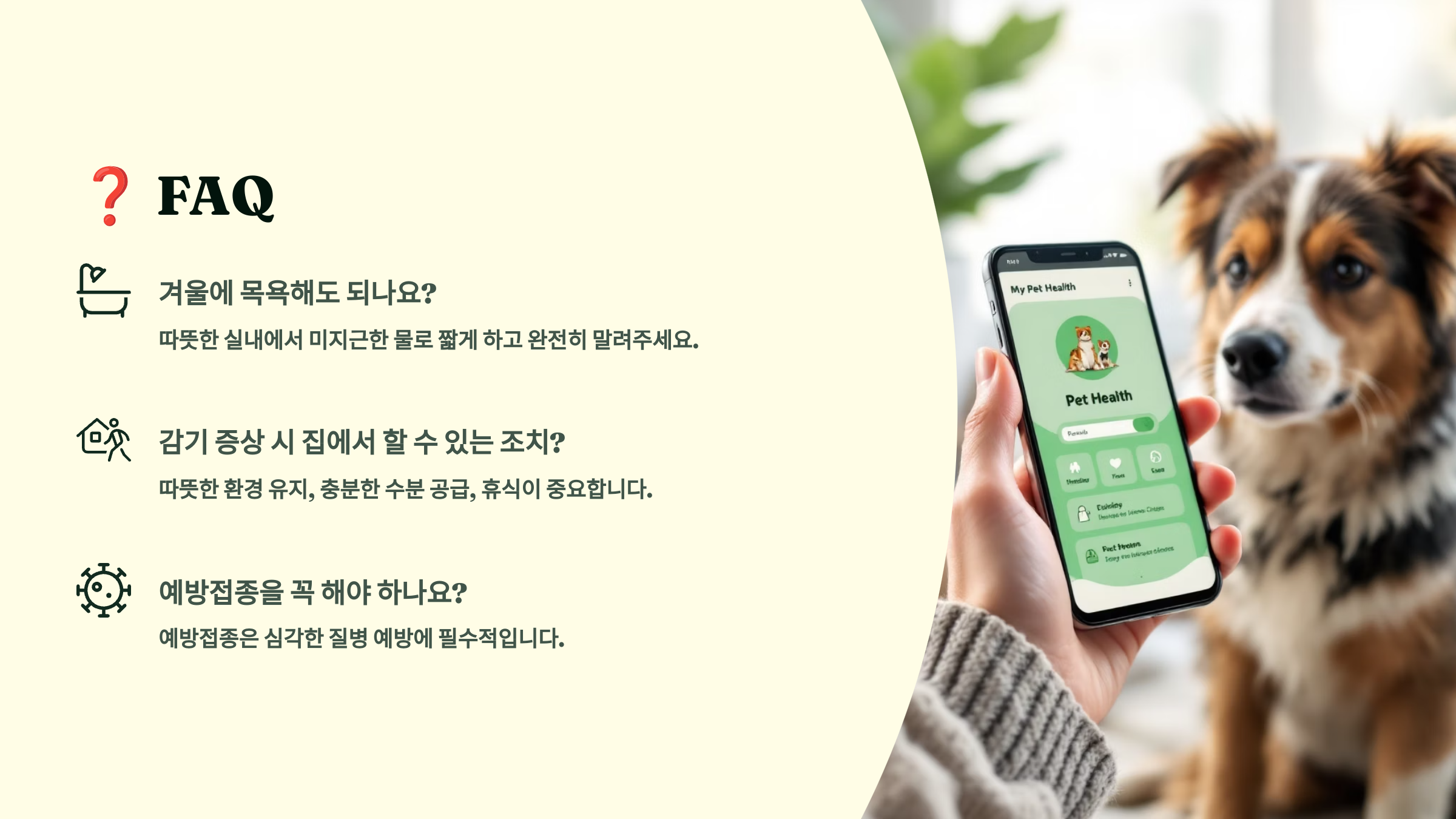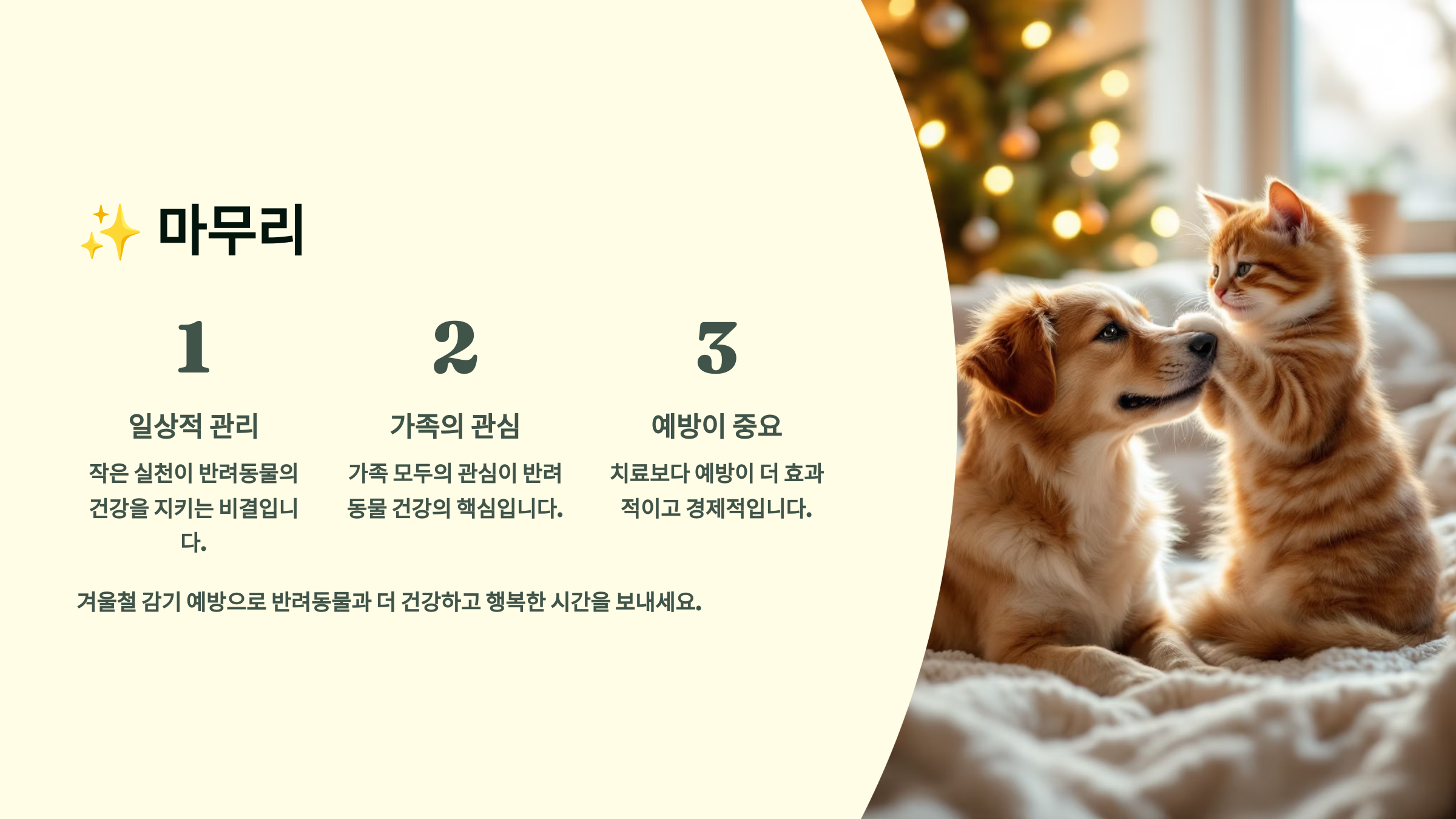 사랑하는 반려동물이 추운 겨울을 건강하게 보낼 수 있도록 오늘부터 체계적인 관리를 시작해보세요. 여러분의 관심과 사랑이 반려동물에게는 가장 좋은 예방약이 될 거예요! ✨