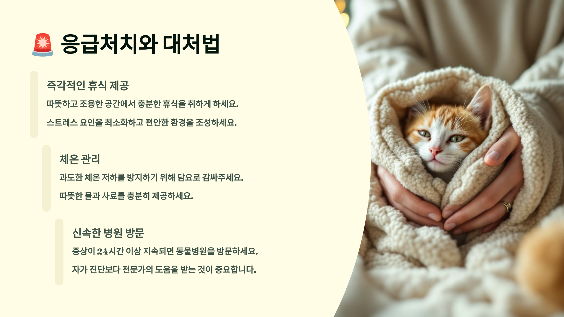 무엇보다 중요한 것은 언제 병원에 가야 하는지 판단하는 것이에요. 38.5도 이상의 발열, 지속적인 기침, 호흡곤란, 식욕 완전 거부, 24시간 이상 지속되는 증상 등이 나타나면 즉시 수의사에게 연락해야 해요. 응급실이 있는 병원의 연락처를 미리 준비해두고, 야간이나 휴일에도 연락할 수 있는 병원을 알아두는 것이 좋아요. 병원에 갈 때는 증상이 시작된 시점, 변화 과정, 시도한 응급처치 등을 기록해서 가져가면 진료에 도움이 되어요.