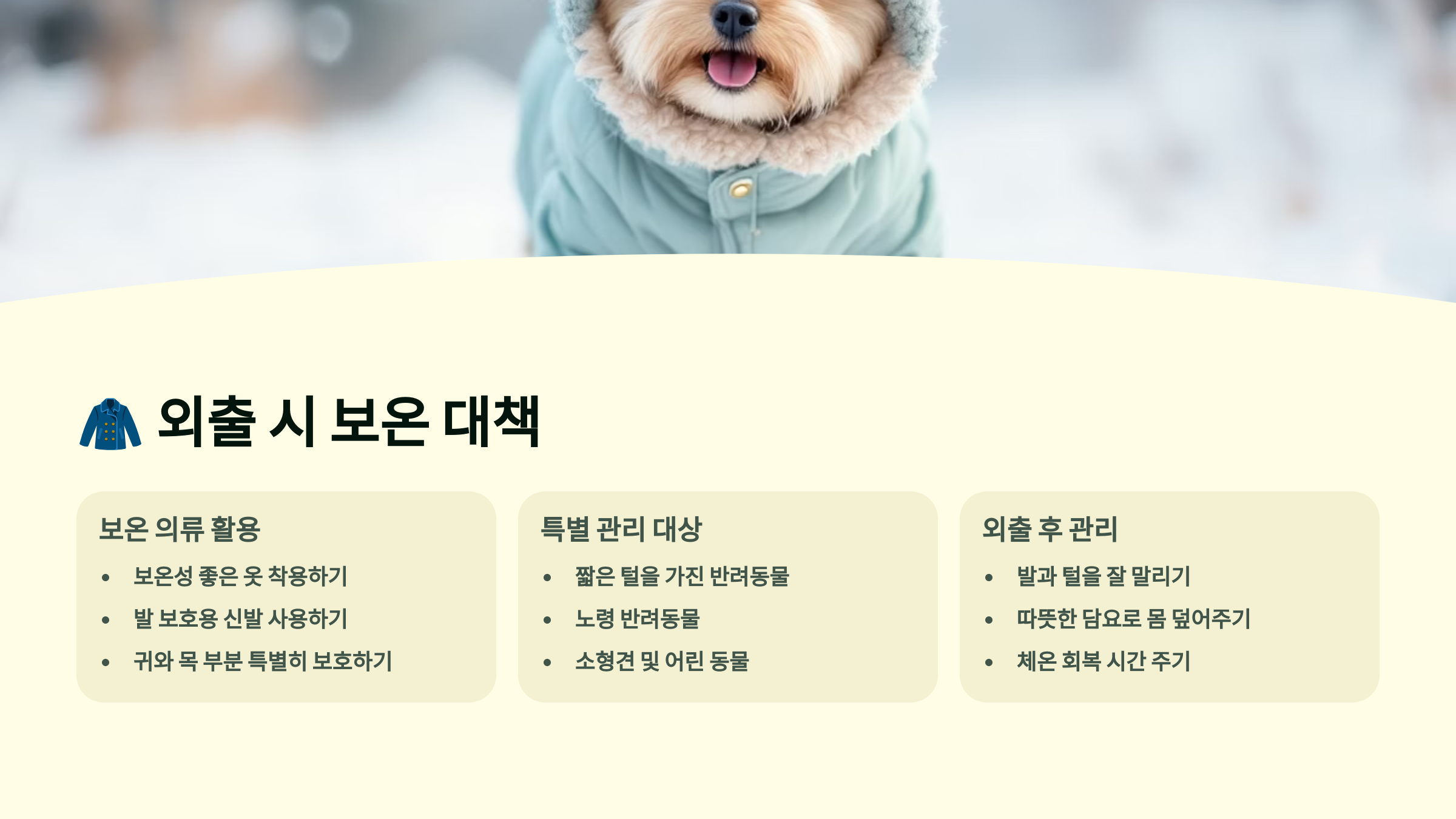 적절한 보온 대책으로 겨울 외출도 안전하게 즐길 수 있어요. 반려동물의 특성에 맞는 보온용품을 선택하세요! 🧥