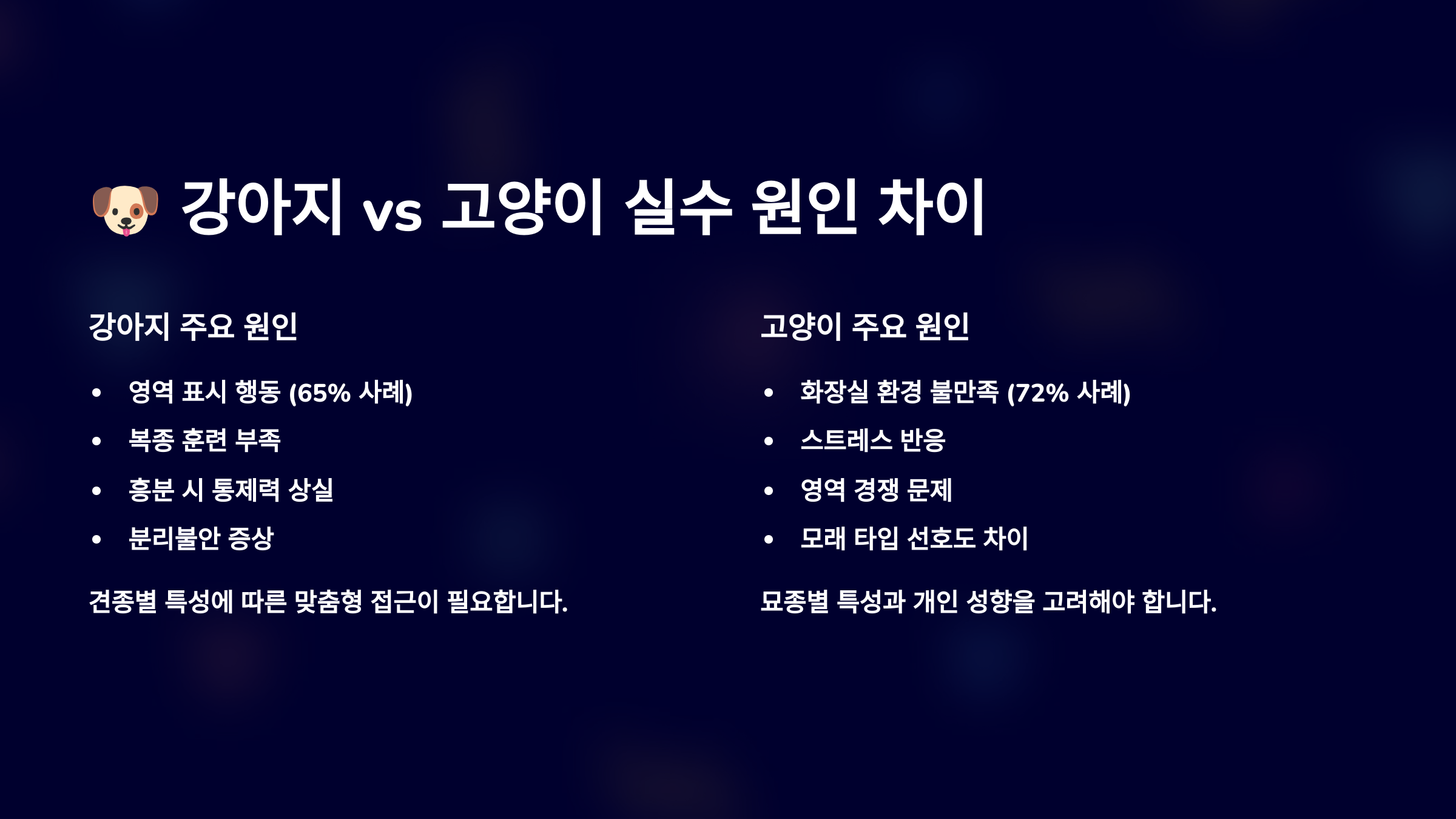 이제 다음 섹션에서는 강아지와 고양이의 배변 실수 이유 차이를 알아볼게요! 같은 실수라도 이유는 전혀 다를 수 있어요. 🐶🐱