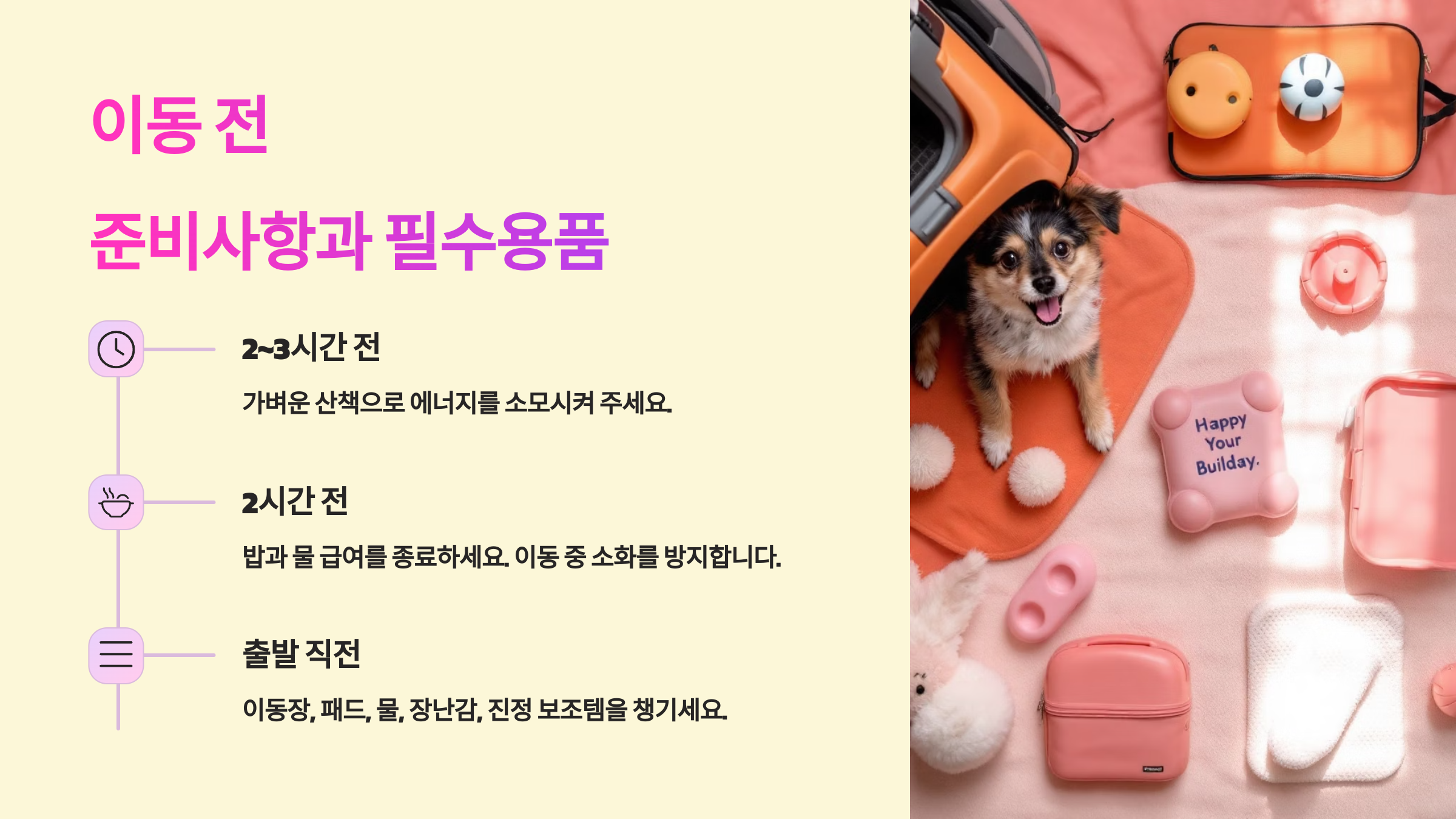 성공적인 반려동물 차량 이동을 위해서는 철저한 사전 준비가 필수예요. 가장 먼저 해야 할 일은 반려동물의 건강 상태를 확인하는 것이에요. 이동 전 동물병원에서 건강검진을 받고, 필요시 진정제나 멀미약에 대한 상담을 받아보세요. 특히 노령견이나 지병이 있는 반려동물의 경우 수의사와 충분히 상의한 후 이동 계획을 세우는 것이 안전해요.