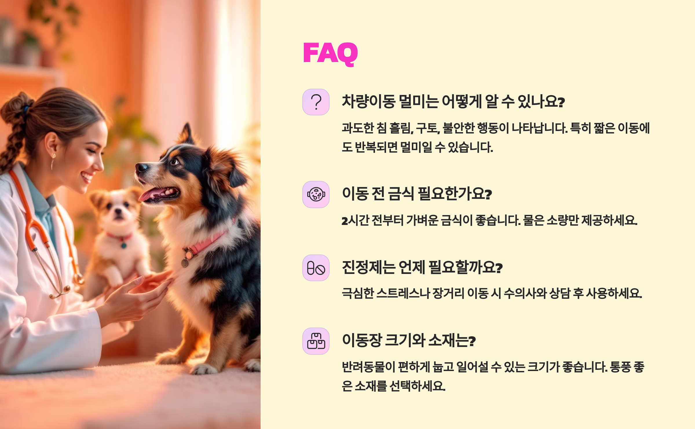 A1. 이동 3-4시간 전부터 금식시키고, 충분한 수분 섭취를 허용하세요. 차량 적응 훈련을 미리 시키고, 부드러운 운전을 하며, 필요시 수의사 처방 멀미약을 사용하면 효과적이에요.