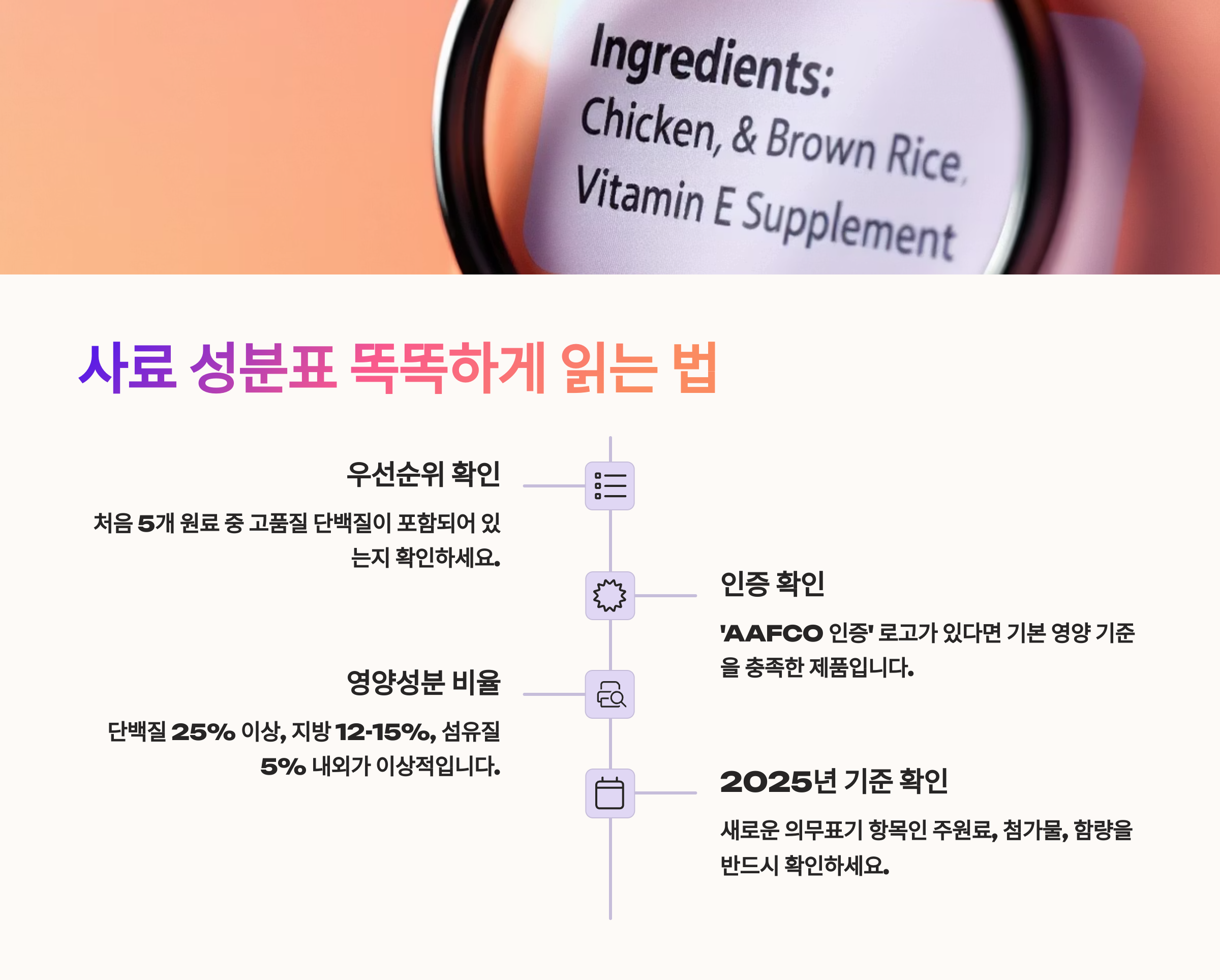 사료를 고를 때 제일 중요한 건 바로 성분표예요. 그런데 이 성분표를 단순히 "단백질 몇 %" 이렇게 숫자로만 보지 말고, 어떤 재료가 어디에 위치해 있는지부터 확인해야 해요. 💡