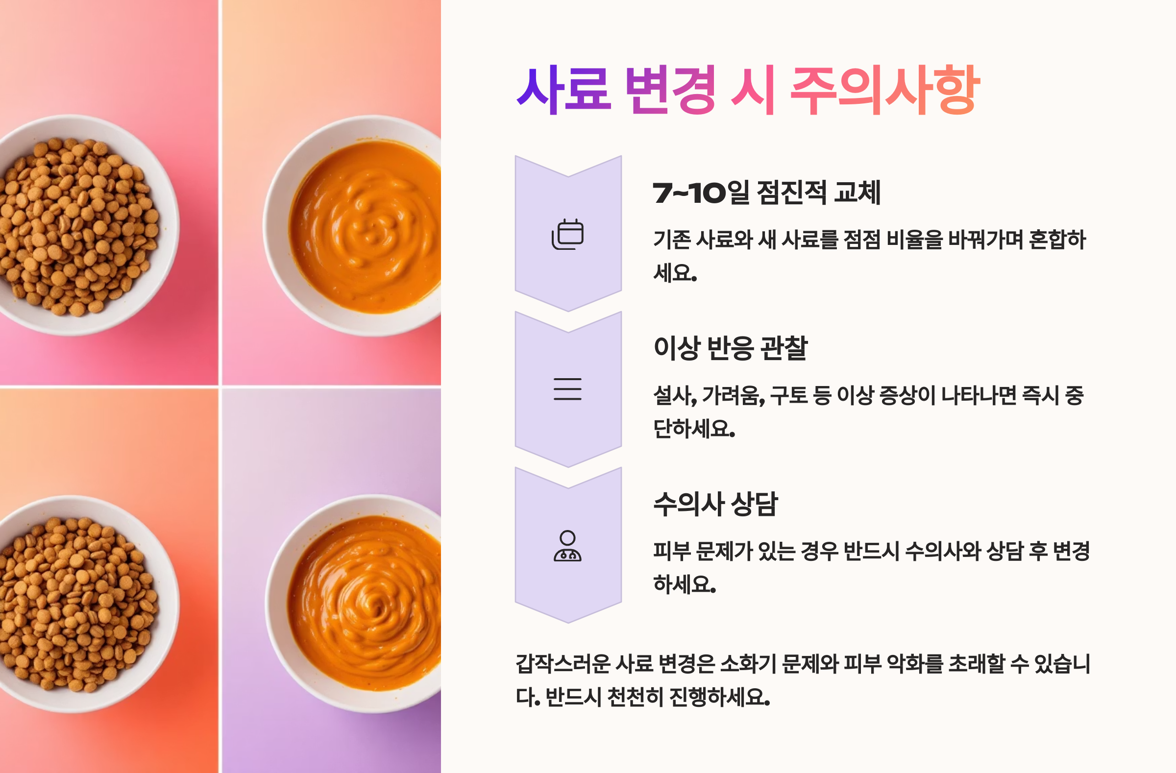 피부병 예방을 위해 사료를 바꾸고 싶을 때, 가장 중요한 건 '천천히, 단계적으로' 바꾸는 거예요. 갑작스러운 변경은 소화 불량, 구토, 설사뿐만 아니라 기존보다 더 심한 피부 트러블을 유발할 수 있어요. 🌀