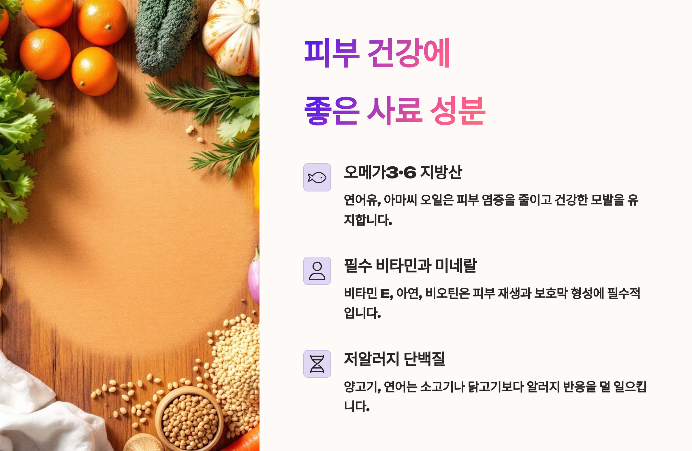 | 오메가3 (EPA/DHA) | 염증 완화, 피부 장벽 강화 | 연어 사료, 정어리 함유 사료 |