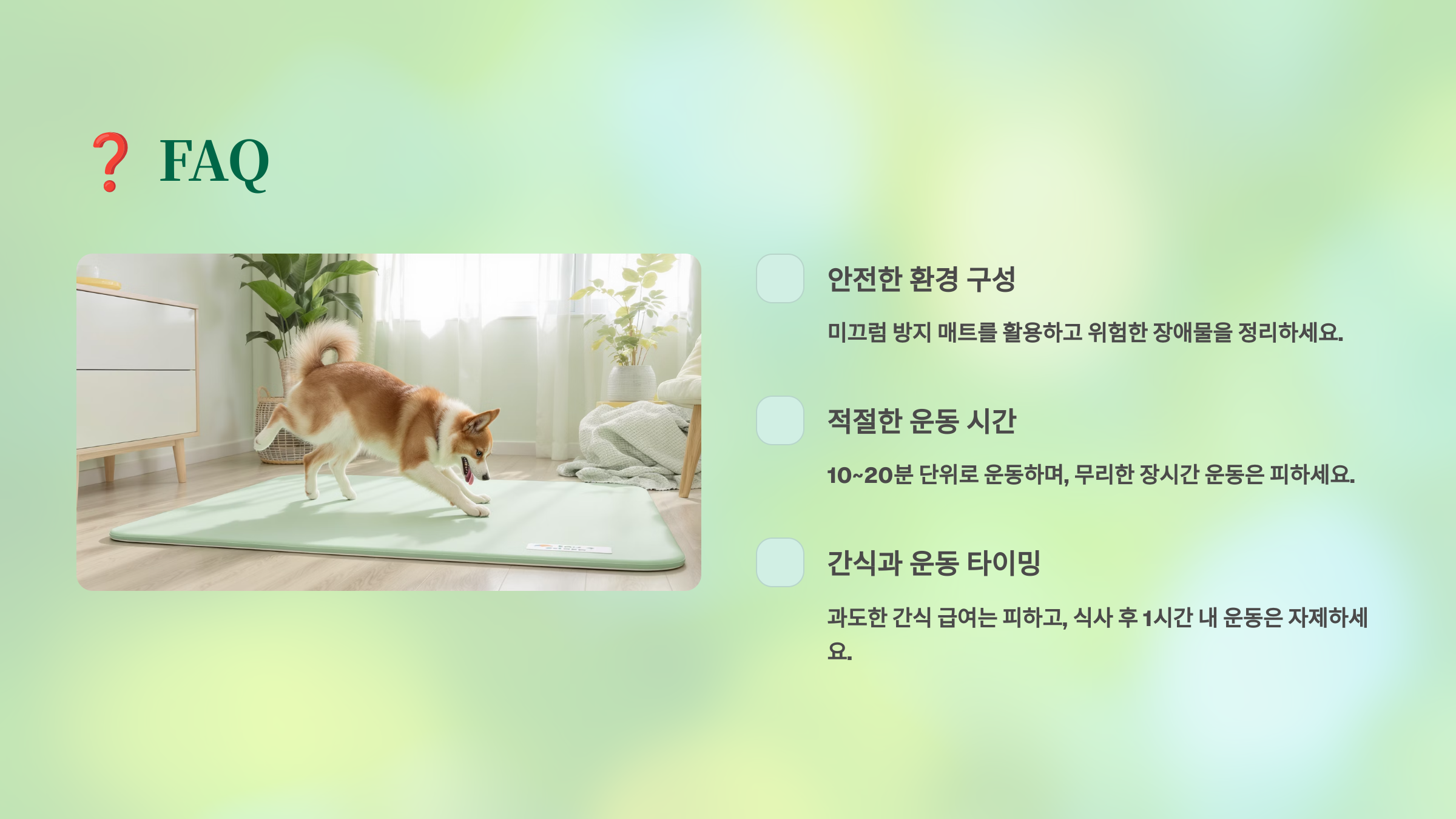 가장 먼저 확인해야 할 것은 바닥 상태예요. 미끄러운 마루나 타일 바닥은 강아지가 달리다가 미끄러져 다칠 수 있어요. 요가 매트, 러그, 또는 미끄럼 방지 매트를 깔아주세요. 특히 방향 전환이 많은 운동을 할 때는 꼭 필요해요. 발톱이 긴 강아지는 미리 손질해주는 것도 잊지 마세요.