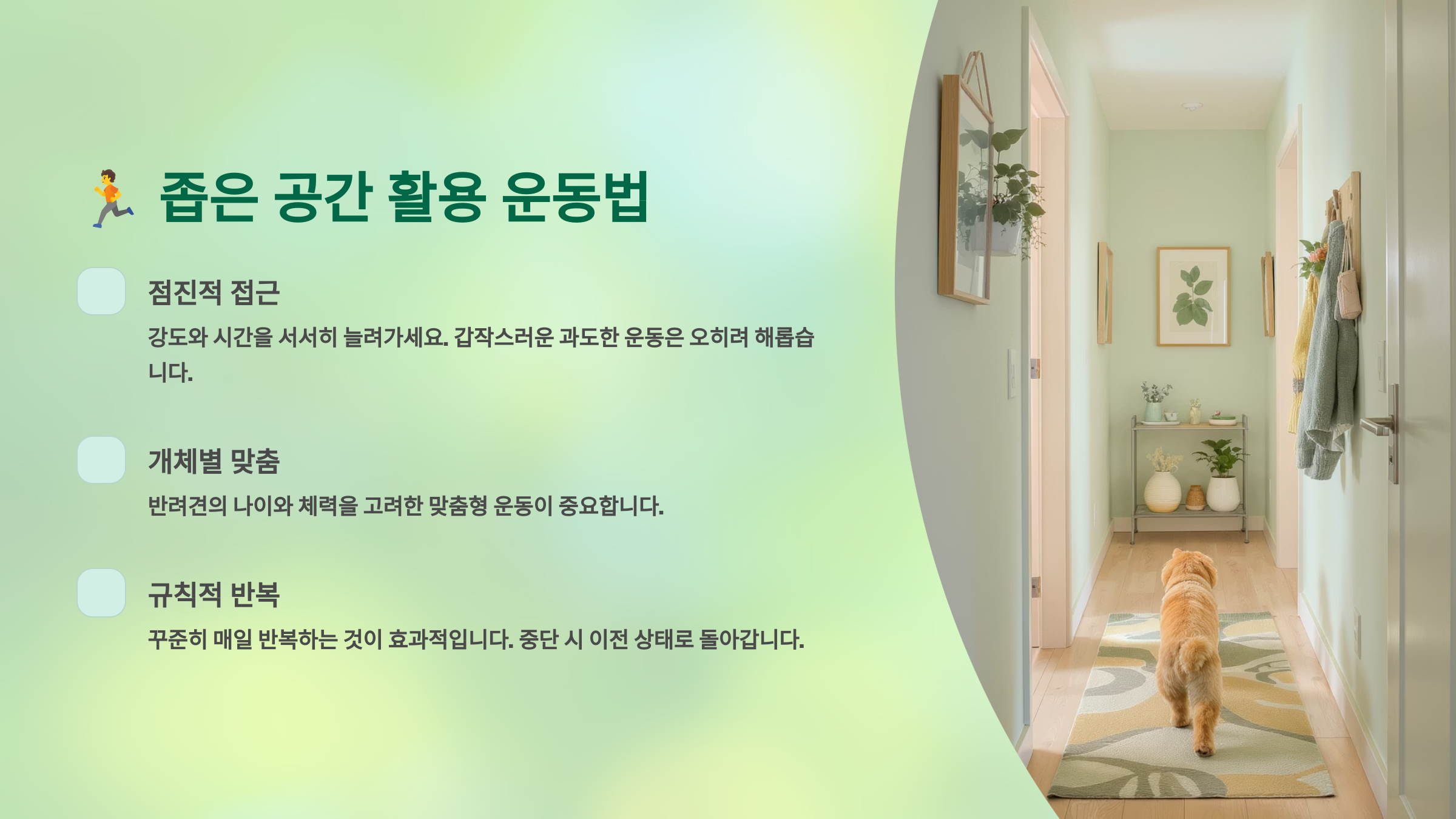 복도나 거실의 긴 공간을 활용한 '왕복 달리기'도 효과적이에요. 한쪽 끝에서 간식이나 장난감을 보여주고 반대편으로 던지면 강아지가 왕복하면서 운동하게 돼요. 이때 바닥이 미끄럽다면 러너나 카펫을 깔아주는 것이 안전해요.
