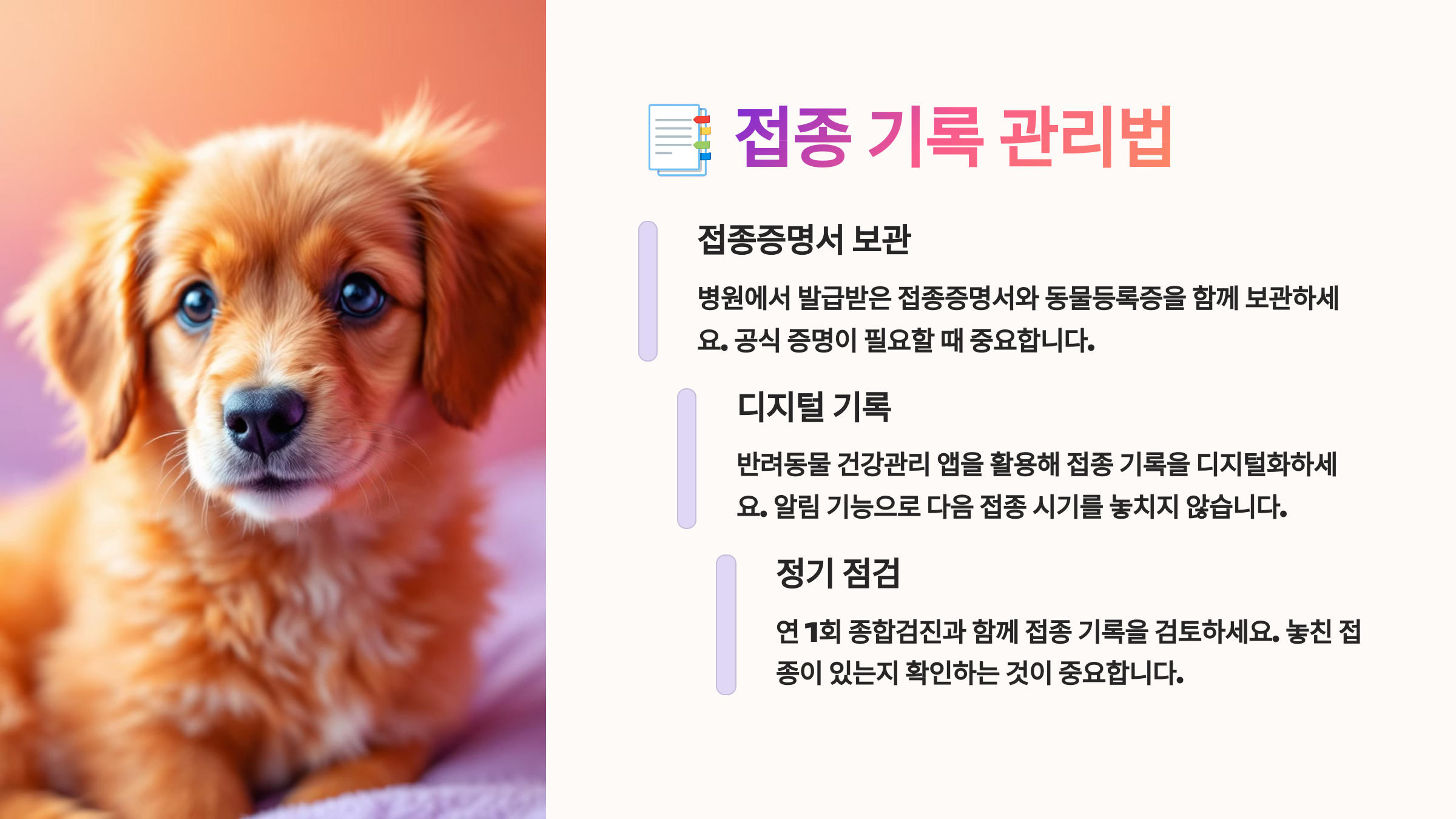 강아지 예방접종, 어렵지 않아요! 차근차근 오늘 배운 것들부터 실천해보세요! 우리 아이도, 보호자님도 더 건강하고 행복해질 거예요. 🐾💕