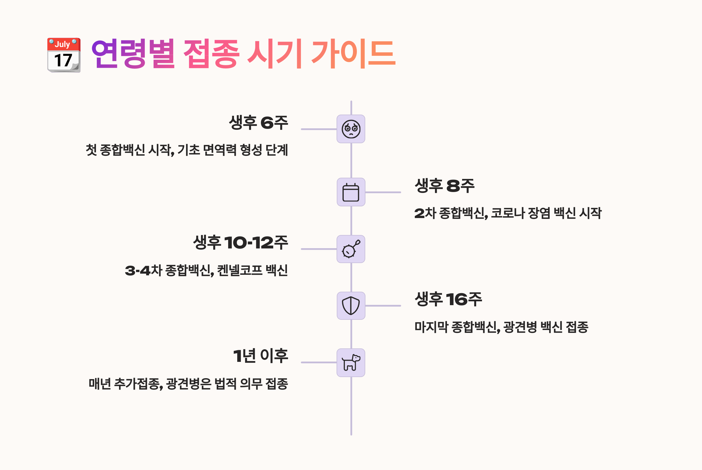 강아지는 사람처럼 면역력이 완전히 형성되기까지 시간이 필요해요. 그래서 생후 몇 주부터 정해진 시기에 따라 접종을 해줘야 해요. 시기를 놓치면 백신 효과가 떨어지거나, 특정 질병에 감염될 위험도 높아지기 때문에 정확한 일정이 정말 중요하답니다. 🗓️