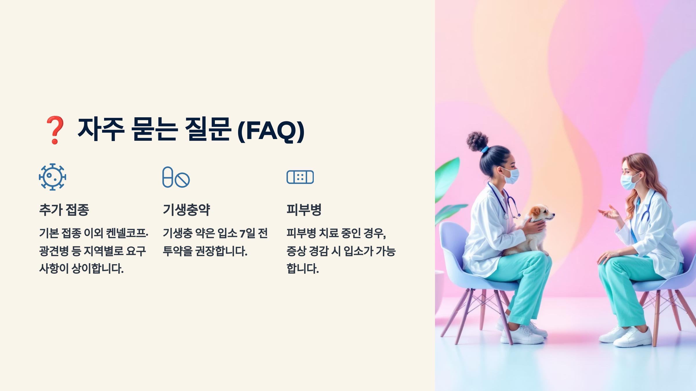 A8. 수의사가 발급한 공식 건강증명서여야 해요. 예방접종 기록, 건강검진 결과, 기생충 검사 결과 등이 포함되어야 하고, 수의사의 서명과 병원 도장이 명시되어야 해요. 일반적으로 발급일로부터 1개월 이내의 것만 인정되므로 너무 일찍 받지 마시고 적절한 시기에 발급받으세요.
