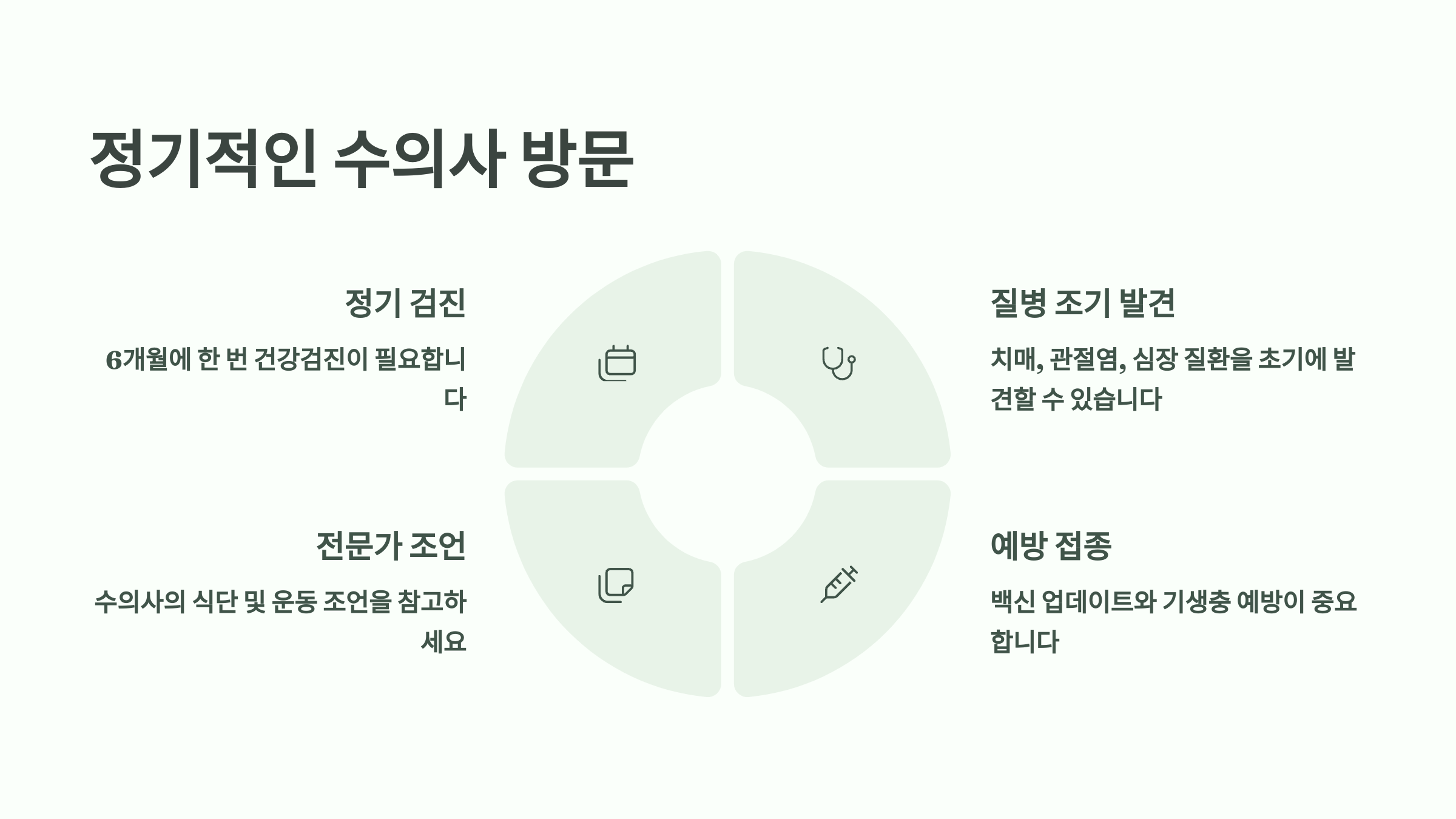노견은 나이가 들수록 다양한 건강 문제가 발생할 수 있어요. 관절 문제, 심장 질환, 당뇨병, 치매 등 여러 가지 질병이 있을 수 있기 때문에, 수의사 방문을 통해 이를 예방하고 조기 발견할 수 있어요. 조기에 발견된 질병은 치료가 훨씬 더 수월하고, 노견의 삶의 질을 향상시킬 수 있어요. 🐶❤️