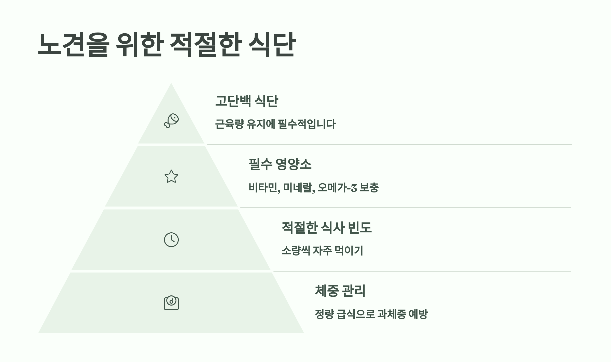 노견에게 적절한 식단을 제공하는 것은 그들의 건강을 유지하는 데 중요한 역할을 해요. 나이에 맞는 사료와 영양소를 제공하며, 체중과 건강을 관리하는 것이 중요해요! 🍖🐾