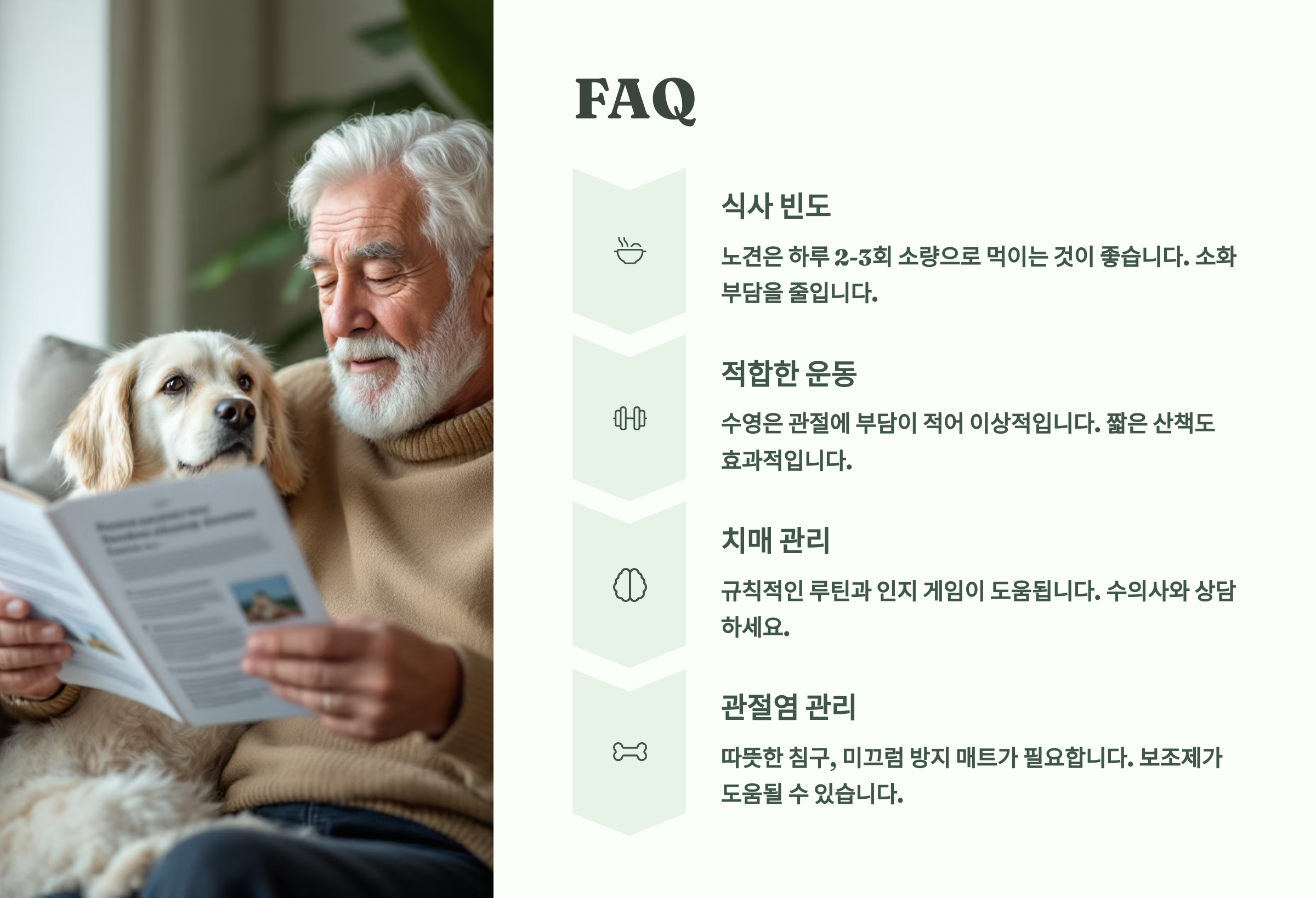 나이가 든 강아지들에게 가장 중요한 점은 정기적인 수의사 방문, 적절한 식단, 운동, 그리고 정신적 건강을 관리하는 것이에요. 이 모든 요소들이 결합되어야 노견이 건강하고 행복한 삶을 살 수 있어요. 🩺🍖💪