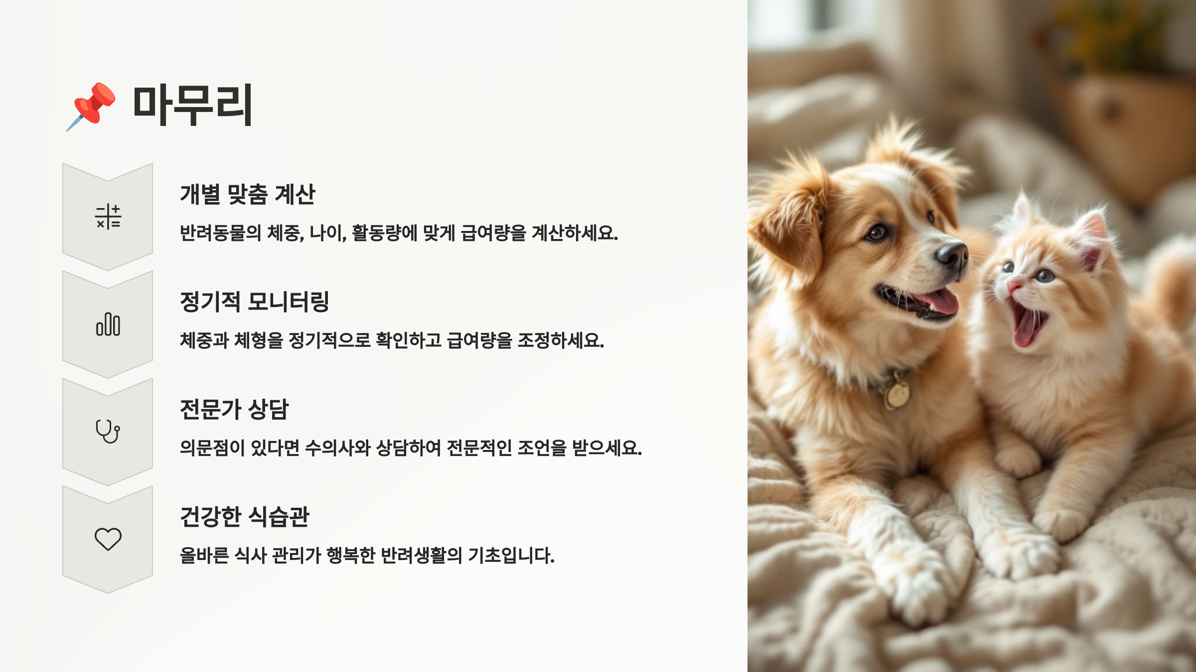 사료봉지 뒤에 적힌 급여량 표만 맹신하기보다는, 직접 계산하는 습관을 들이는 게 좋아요. 반려동물의 상태에 딱 맞는 식사량을 계산해주는 것이 진정한 '사랑'이 아닐까요? ❤️