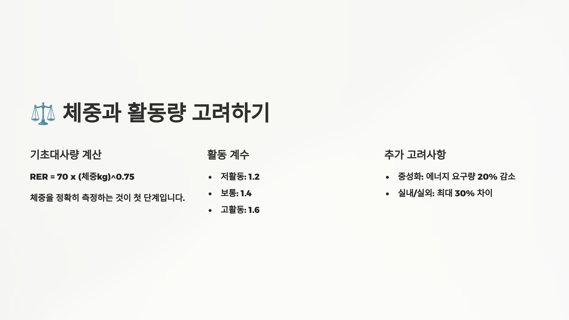 기초적인 급여 계산은 RER(Rest Energy Requirement, 기초에너지요구량)으로 시작해요. 이 값은 반려동물이 아무것도 하지 않아도 필요한 최소 에너지를 뜻해요. 여기에 활동지수를 곱해서 실제 필요 에너지를 구하는 거예요!