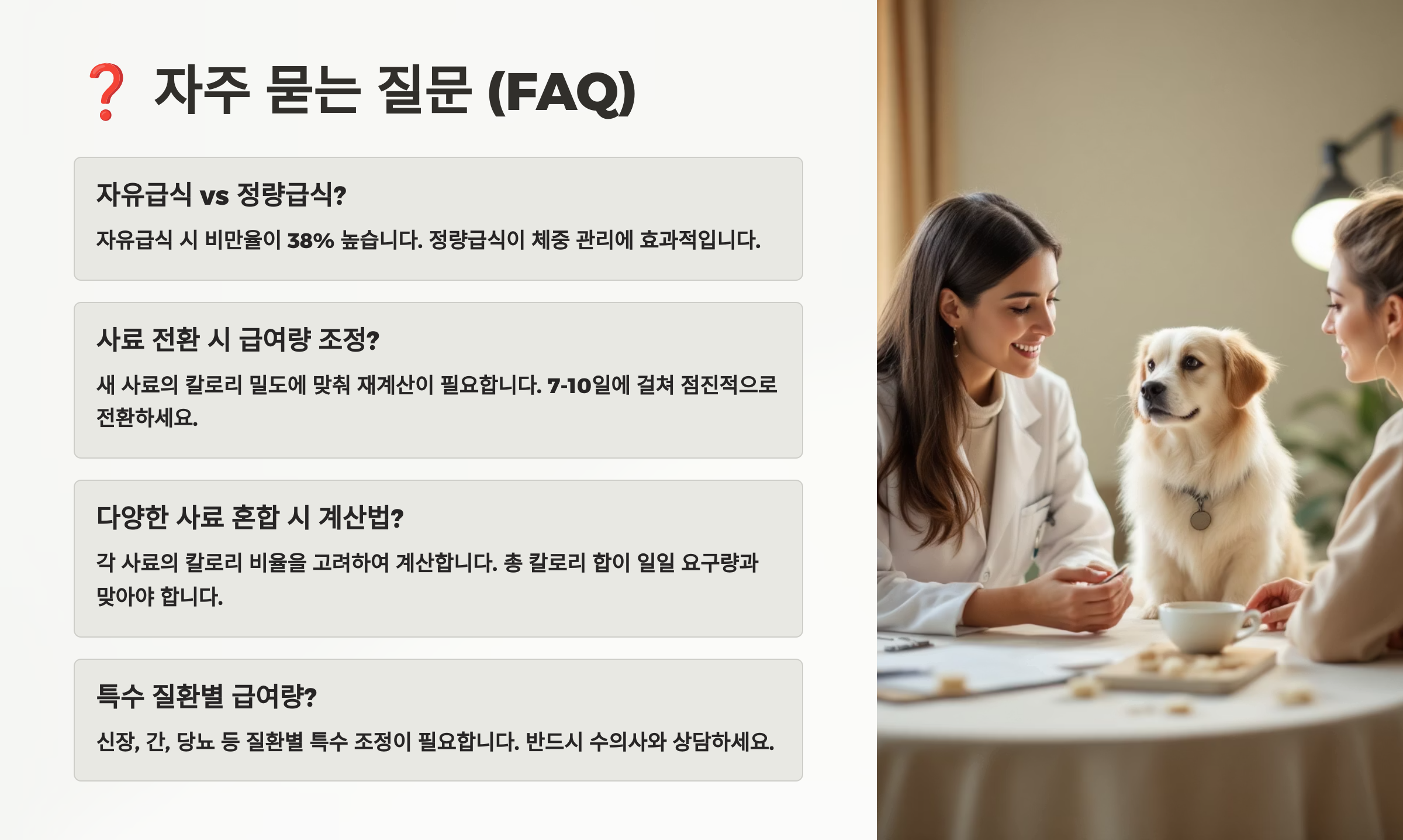 급여량은 고정된 수치가 아니라 상황에 따라 달라져야 해요. 컨디션, 계절, 건강상태에 따라 유동적으로 조절해줘야 반려동물이 건강하게 생활할 수 있어요.