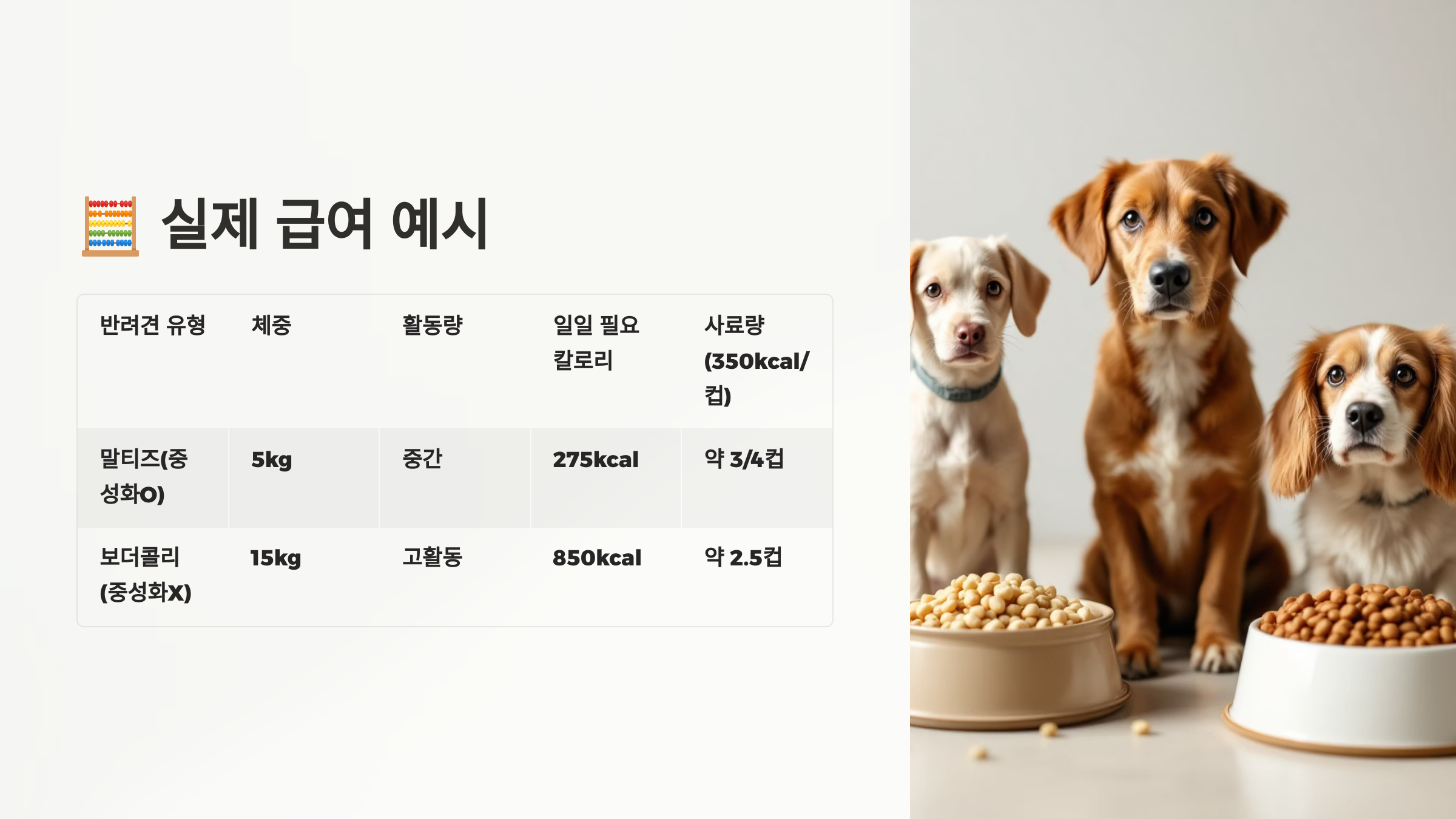지금부터는 실제로 어떻게 급여량을 계산하고 적용하는지 살펴볼게요. 반려동물의 건강은 실제 실천에서 시작된답니다. 예시를 통해 조금 더 쉽게 이해할 수 있어요.
