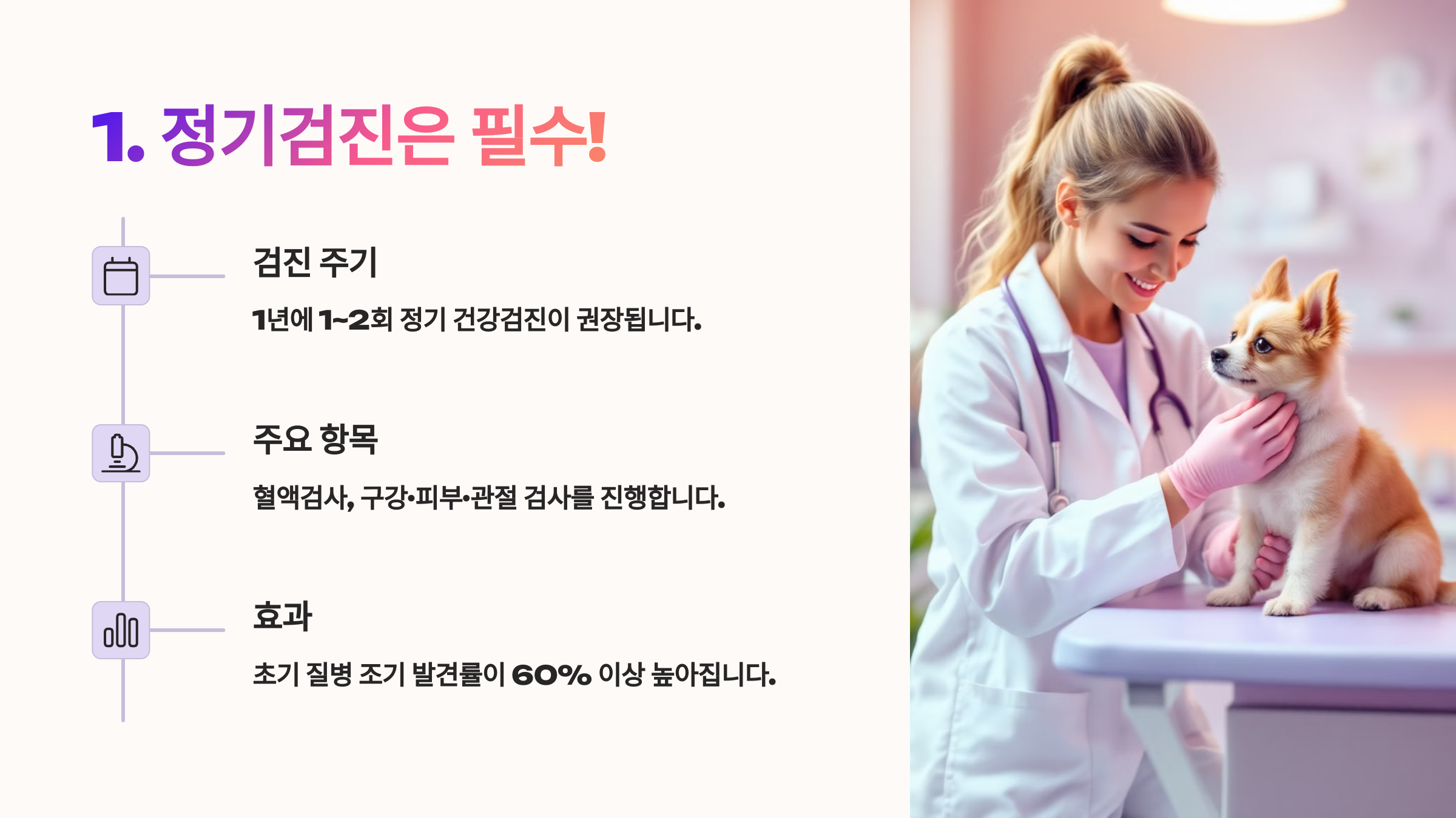 반려동물 건강관리에서 가장 기본이자 중요한 건 정기적으로 병원에 가는 것이에요. 아무 증상이 없더라도 적어도 1년에 1~2회 건강검진은 꼭 받아야 해요!