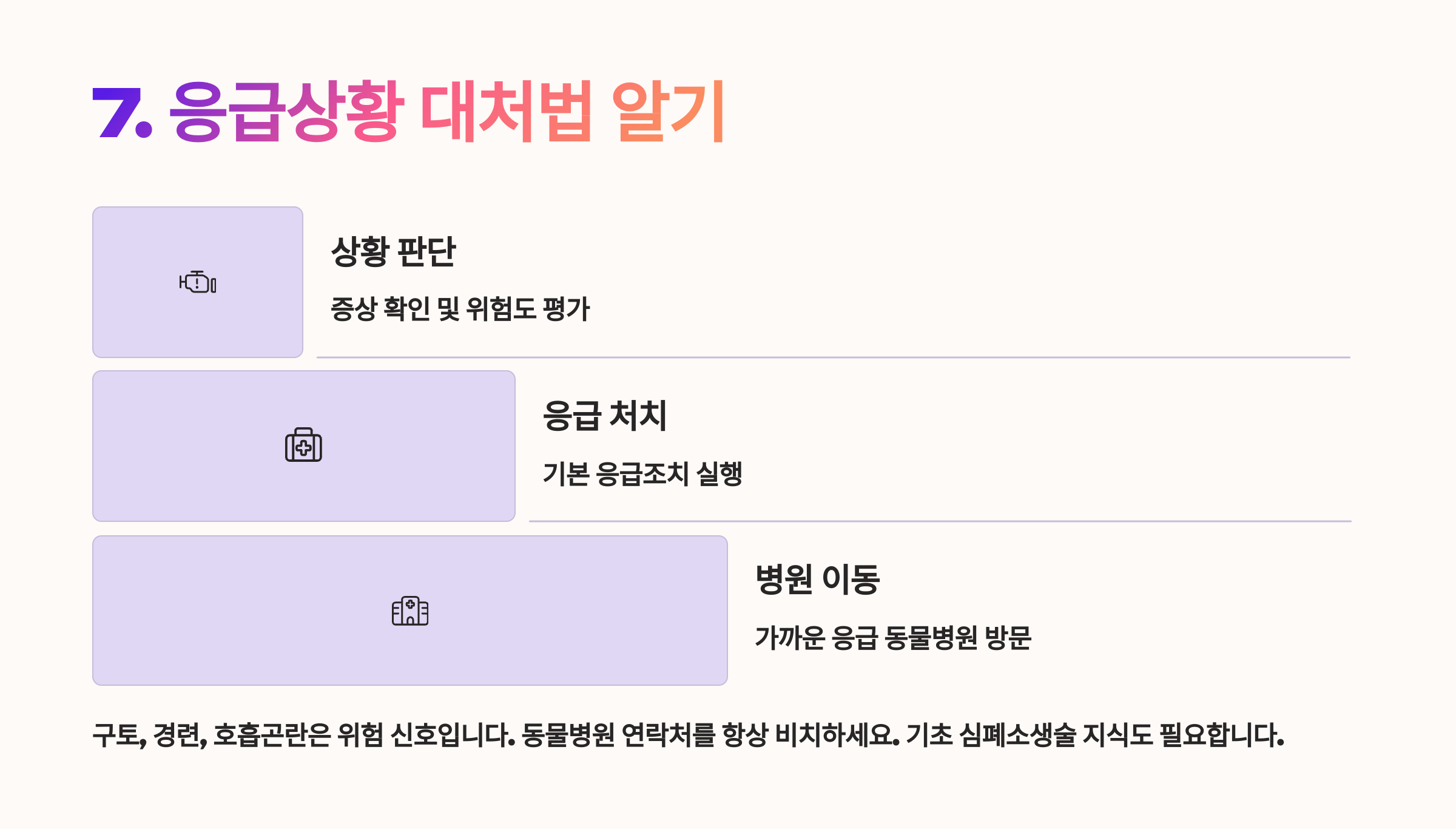 • 📦 반려동물 전용 구급상자 준비 (거즈, 지혈제 등)