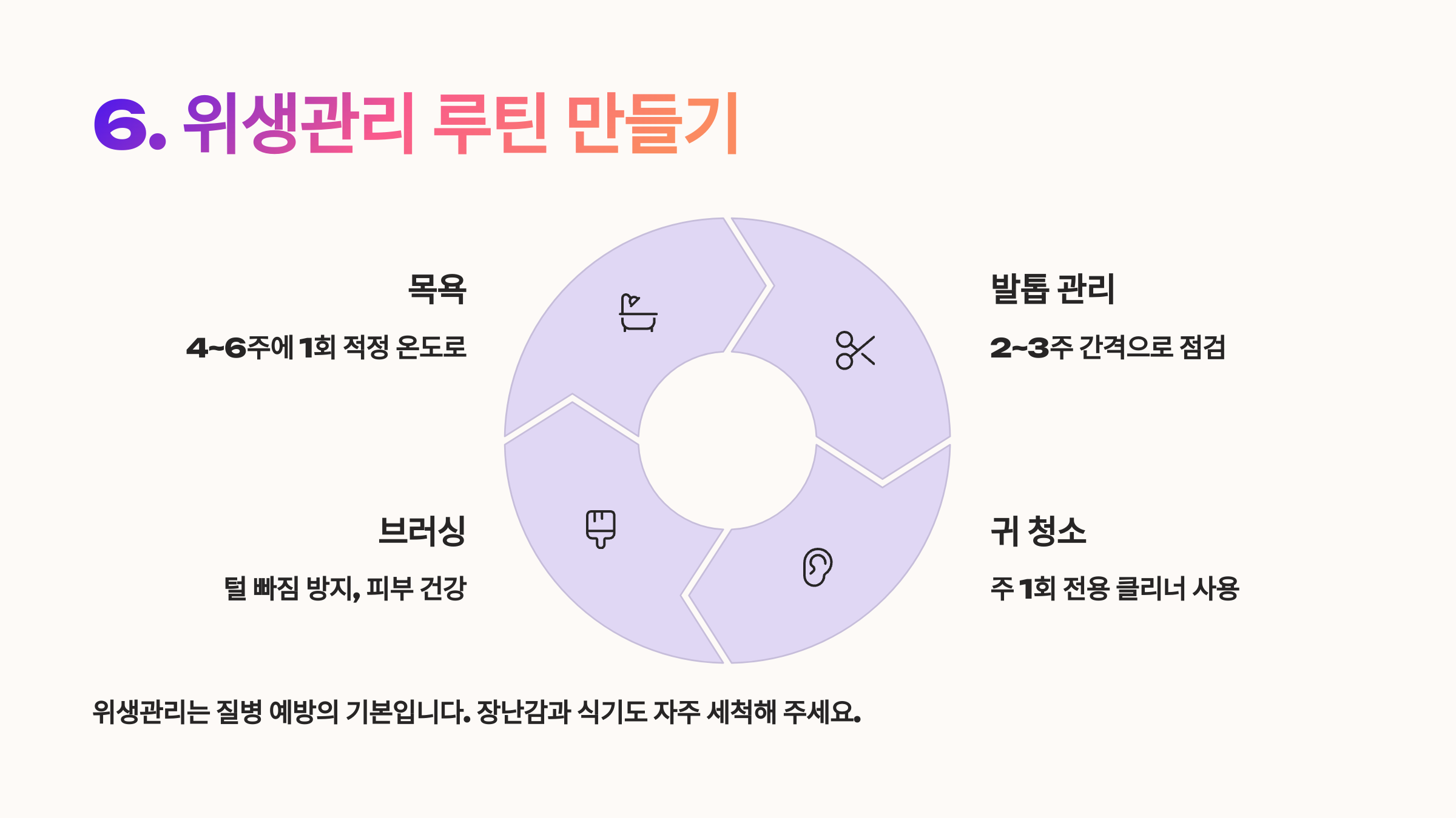 • 👂 귀 청소: 2주~1개월 간격으로 면봉 대신 전용 용액