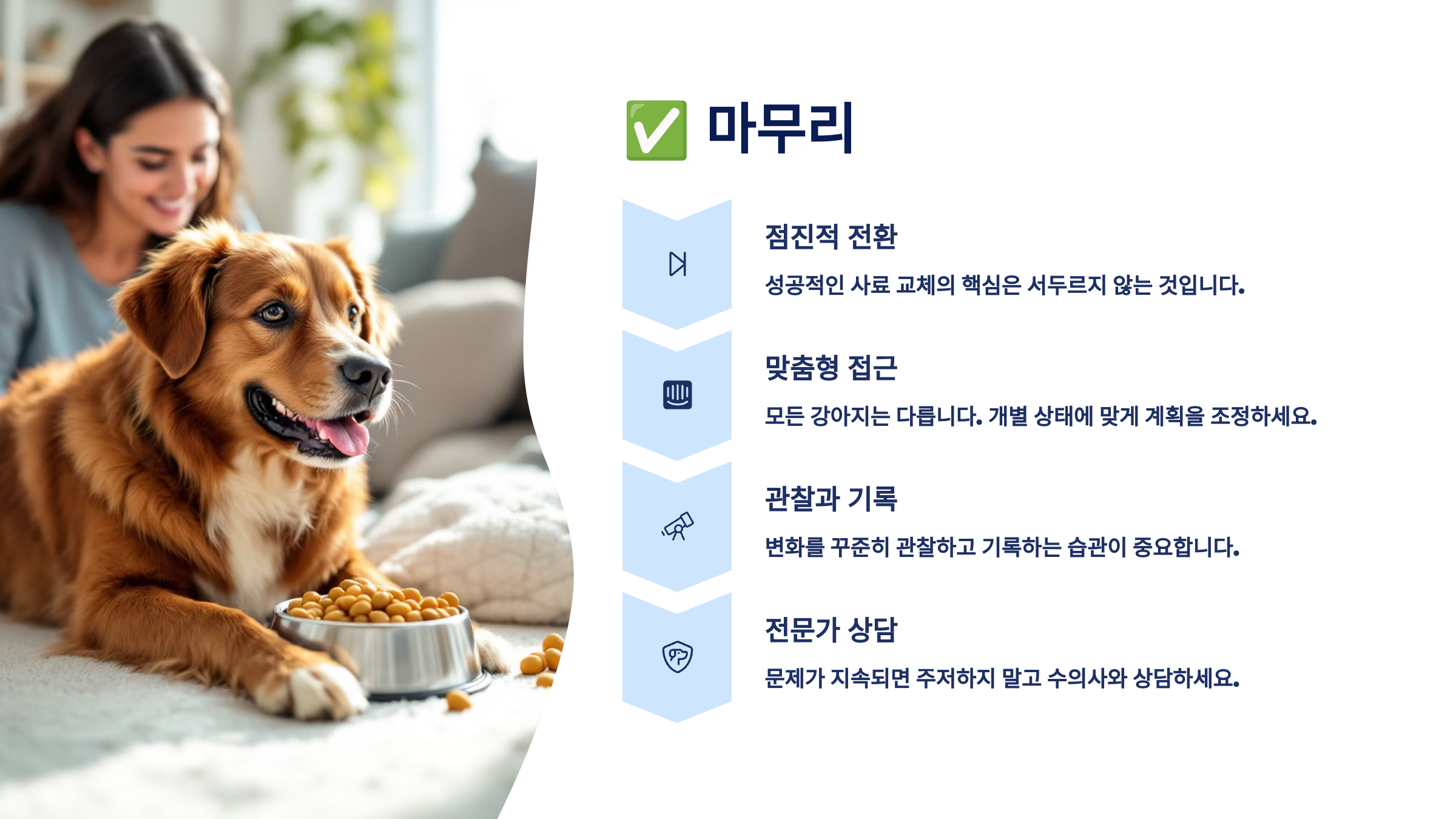 이번 글을 통해 사료를 바꾸는 이유와 방법, 주의사항까지 정확하게 이해하셨을 거예요. 이해하고 나면 막연한 불안보다 명확한 기준을 가지고 교체할 수 있게 돼요. ✅📚