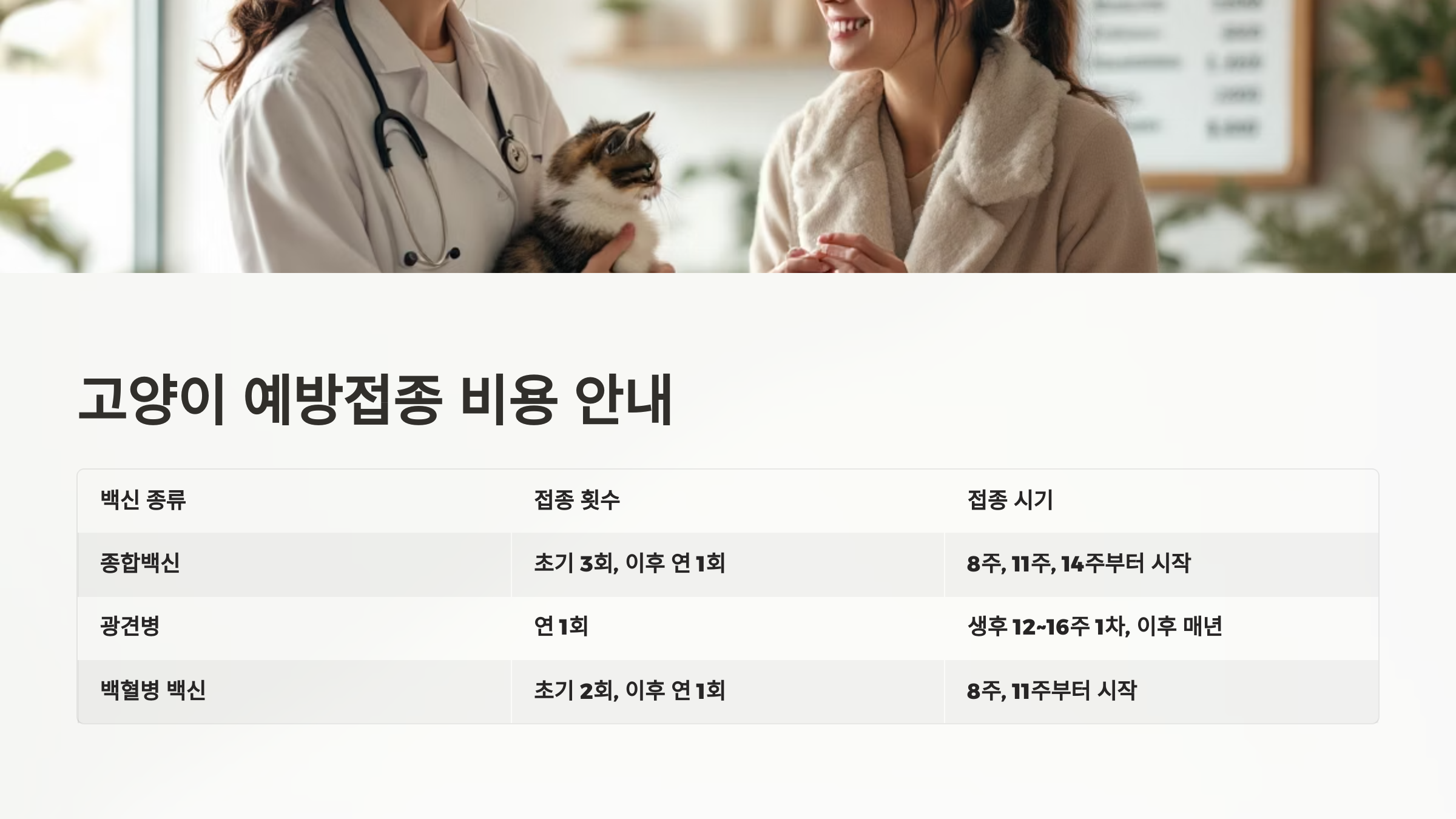 | 기초 3종 백신 | 허피스, 칼리시, 범백 | 모든 고양이 | 생후 8주부터 접종 |