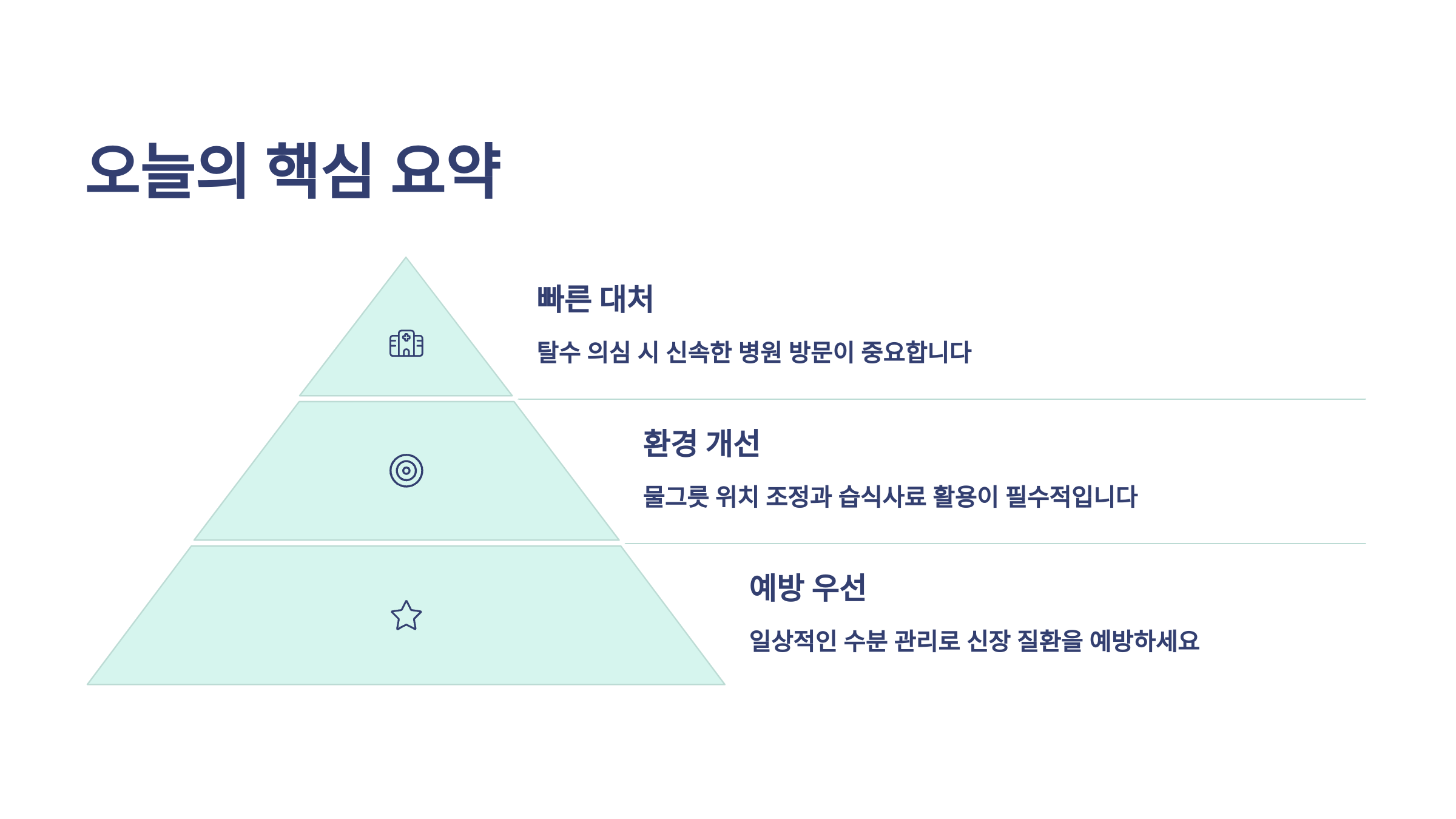 | 경미한 탈수 (3-5%) | 약간의 기운 없음, 코 건조 | 물 공급량 늘리기 |