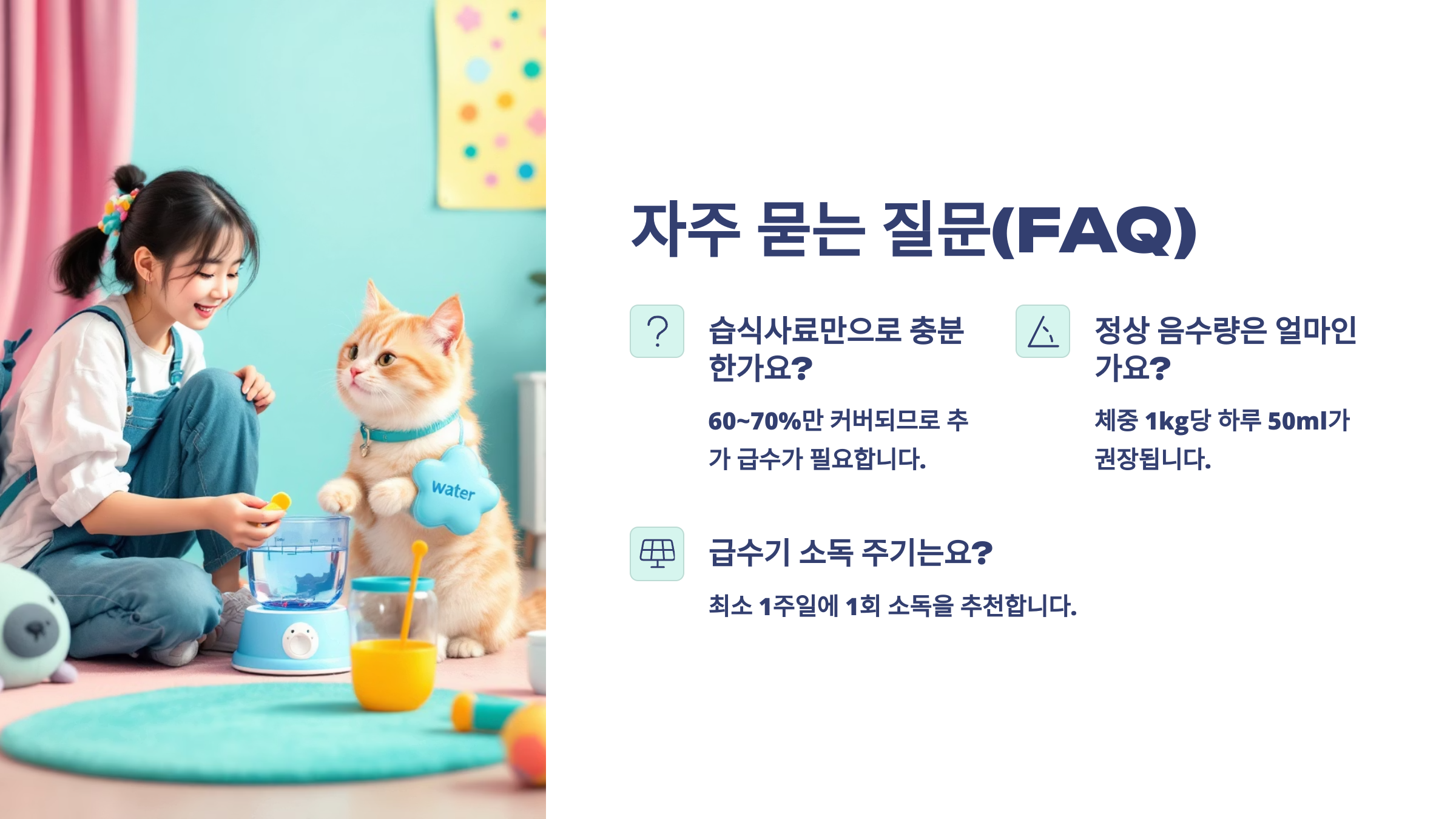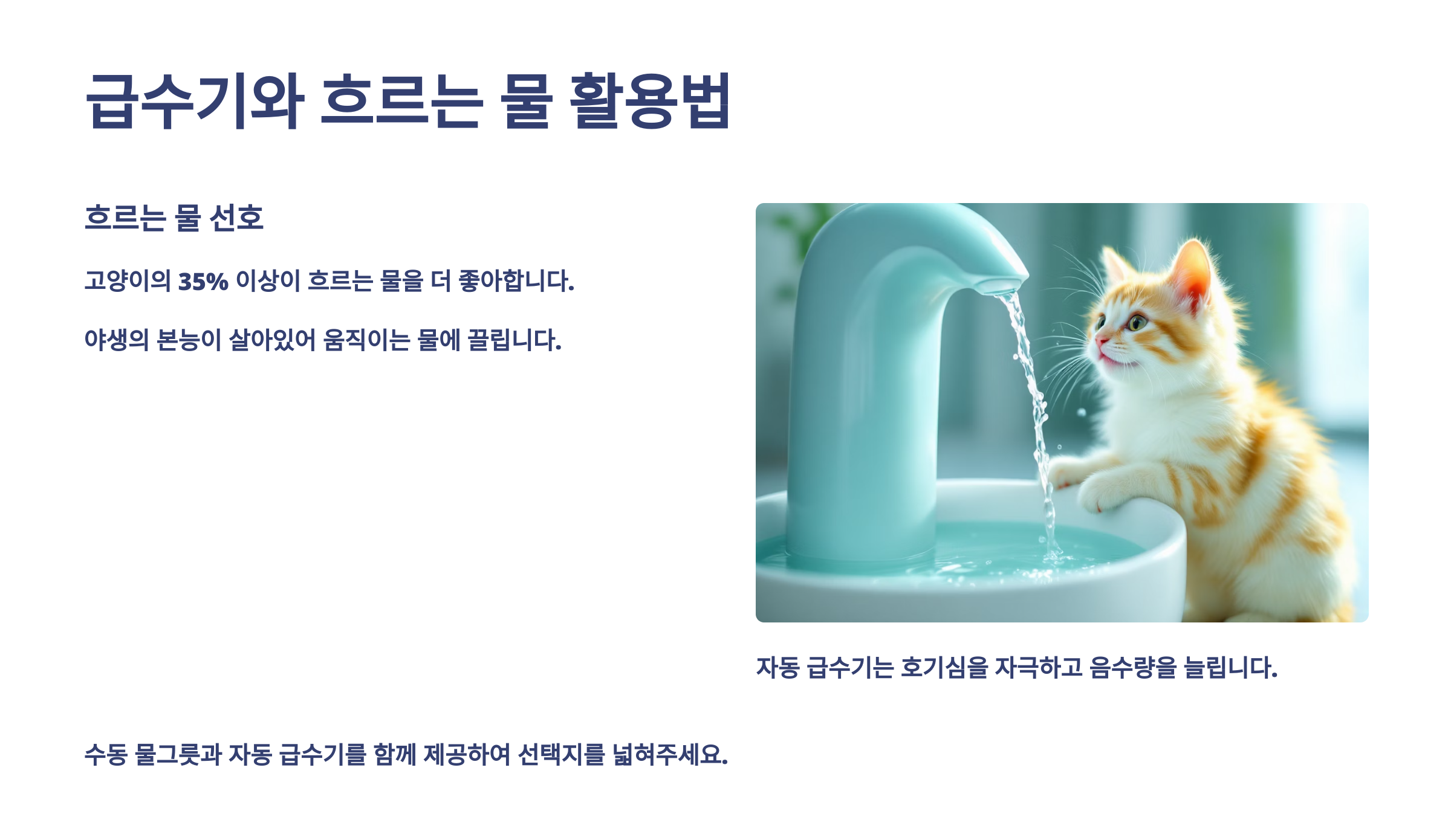 탈수는 신장 질환, 요로결석, 변비 등 심각한 건강 문제로 이어질 수 있어요. 하지만 올바른 방법을 알면 고양이가 자연스럽게 더 많은 물을 마시도록 유도할 수 있답니다. 물그릇 위치부터 급수기 활용, 습식사료 병행, 물 맛내기까지 다양한 실전 팁들을 통해 우리 고양이의 수분 섭취량을 늘려보세요!