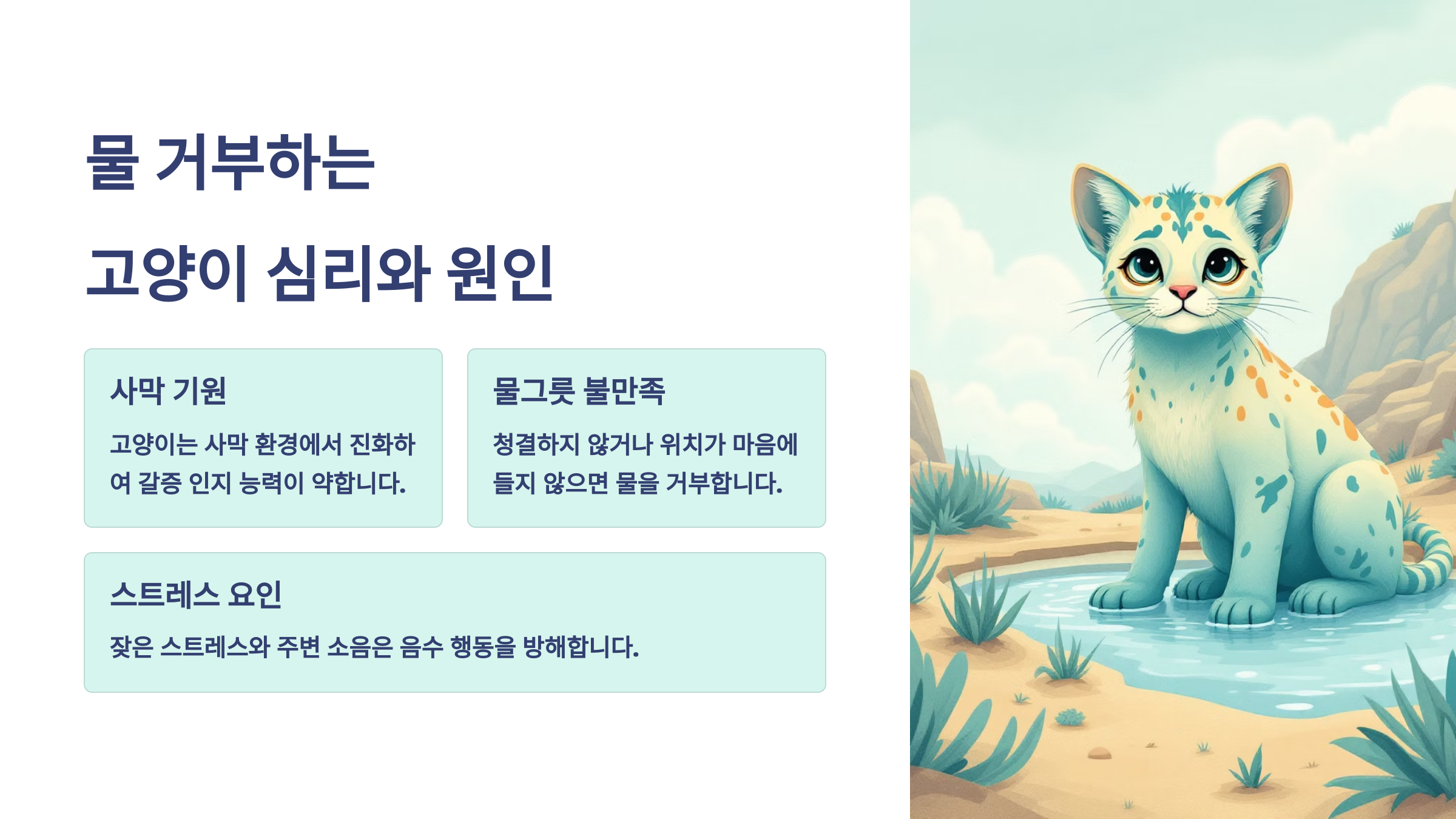 고양이가 물을 마시지 않아 걱정이신가요? 건강한 성묘는 하루에 체중 1kg당 50-100ml의 물이 필요한데, 많은 고양이들이 충분한 수분을 섭취하지 않아요. 특히 건식사료만 먹는 고양이들은 만성 탈수 상태에 빠질 위험이 높답니다. 고양이의 조상인 사막고양이는 먹이를 통해 대부분의 수분을 섭취했기 때문에, 현대 집고양이들도 여전히 갈증을 잘 느끼지 못하는 특성을 가지고 있어요.