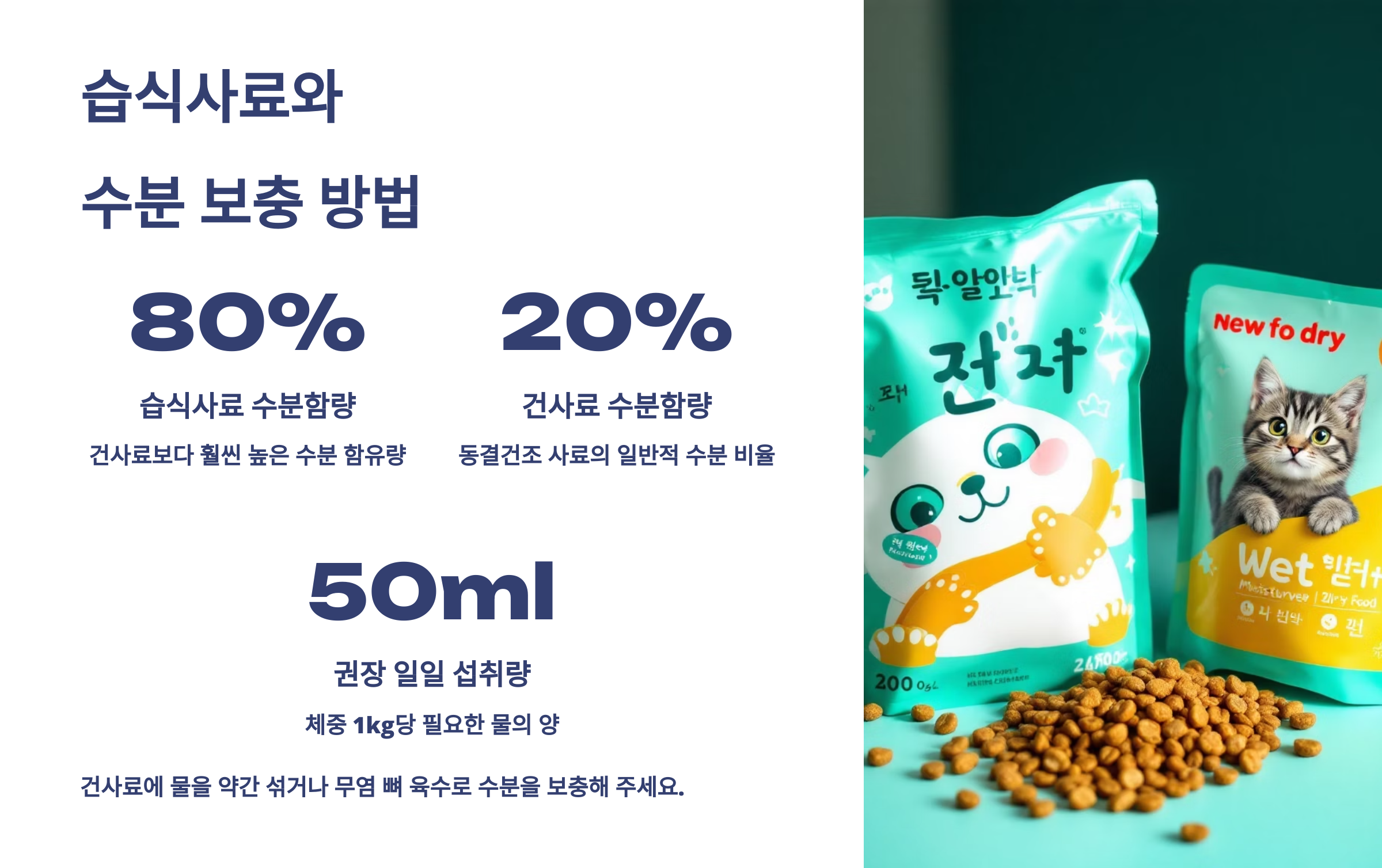 | 체중(kg) | 하루 습식사료 권장량 | 수분 섭취량 | 추가 물 필요량 |