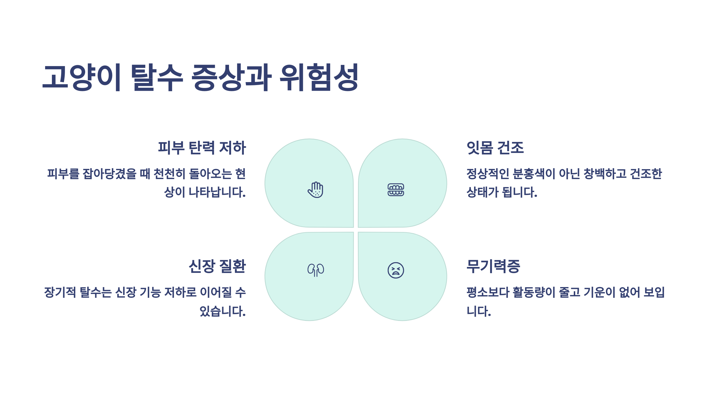 | 중등도 탈수 (5-10%) | 피부 탄력 저하, 잇몸 끈적함 | 즉시 수의사 상담 |