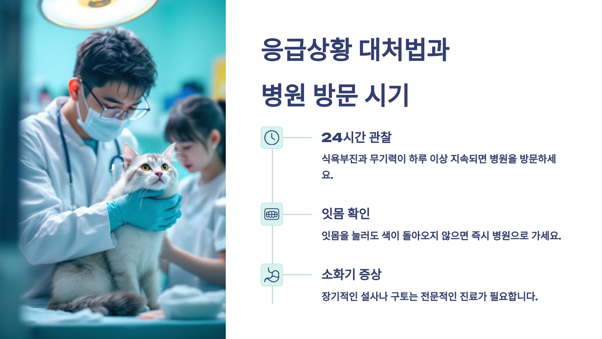 하지만 응급처치는 어디까지나 임시방편이고, 근본적인 해결책은 수의사의 진료를 받는 것이에요. 다음과 같은 증상이 나타나면 지체하지 말고 즉시 병원에 가야 해요. 고양이가 의식을 잃거나 반응이 없는 경우, 체온이 정상보다 현저히 낮거나 높은 경우, 지속적인 구토나 설사로 탈수가 계속 진행되는 경우, 소변을 전혀 보지 않거나 극소량만 보는 경우, 호흡이 빠르고 얕아지는 경우 등이에요. 이런 증상들은 생명을 위협할 수 있는 심각한 상태의 신호일 수 있어요. 특히 수컷 고양이가 소변을 보지 못하는 경우는 요로폐색 가능성이 높아서 몇 시간 내에 생명이 위험할 수 있어요.