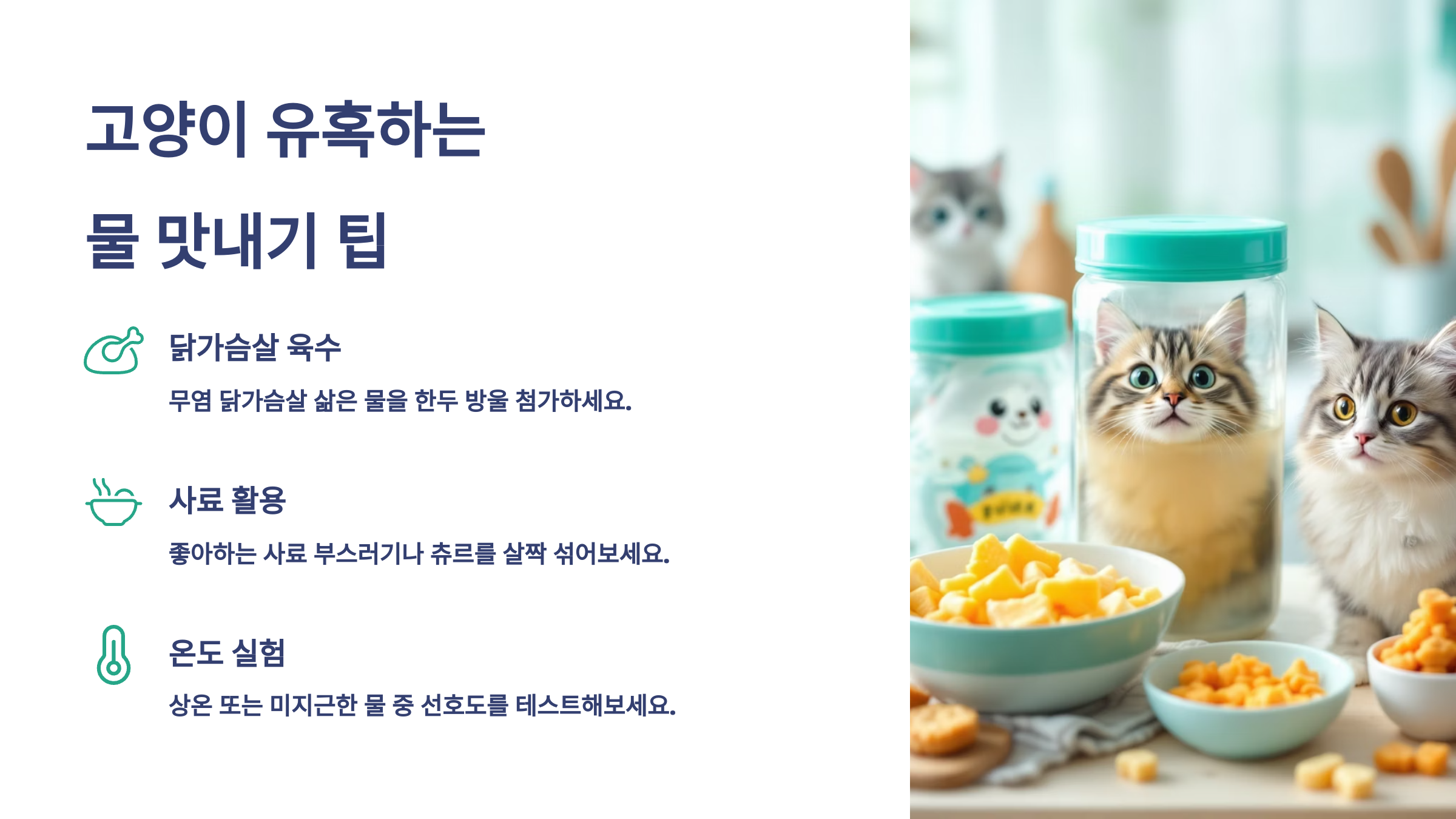 상업적으로 판매되는 고양이용 물 첨가제도 있어요. 액체 형태나 분말 형태로 나오는데, 고양이가 좋아하는 맛과 향을 인공적으로 만든 제품들이에요. 사용법이 간단하고 보관도 편리해서 많은 집사들이 이용하고 있어요. 하지만 인공 첨가물이 들어있을 수 있으니까 성분을 꼼꼼히 확인하고, 자연 재료로 만든 제품을 선택하는 것이 좋아요. 또한 고양이마다 선호하는 맛이 다르니까 여러 종류를 시도해보면서 우리 고양이에게 맞는 제품을 찾아야 해요. 일부 제품들은 비타민이나 미네랄을 추가로 함유하고 있어서 영양 보충 효과도 있어요.