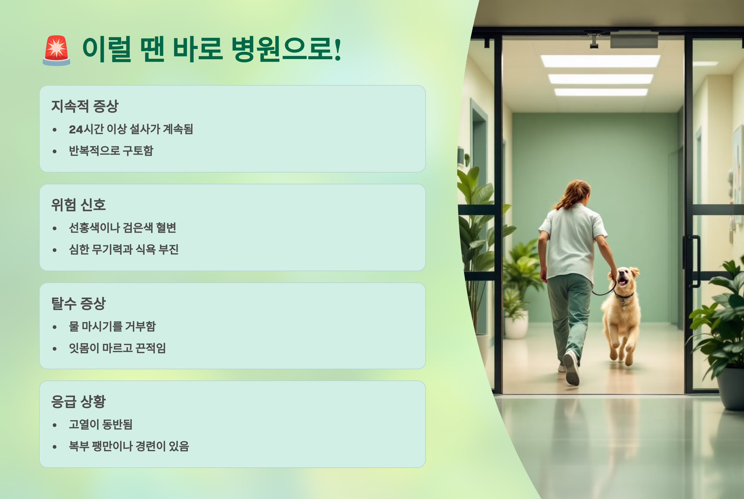 - 심한 구토 동반: 설사와 함께 잦은 구토가 나타나면 탈수가 매우 빠르게 진행될 수 있습니다. 특히 물도 토하는 경우 더욱 위험합니다.