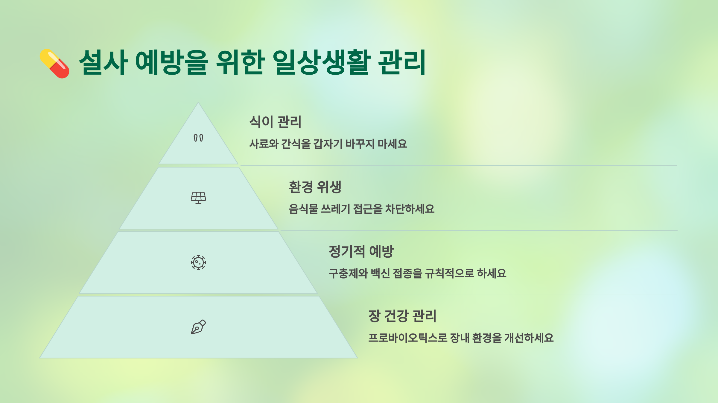 균형 잡힌 식단, 스트레스 관리, 청결한 환경 유지, 그리고 정기적인 구충과 접종은 설사 예방의 핵심입니다.