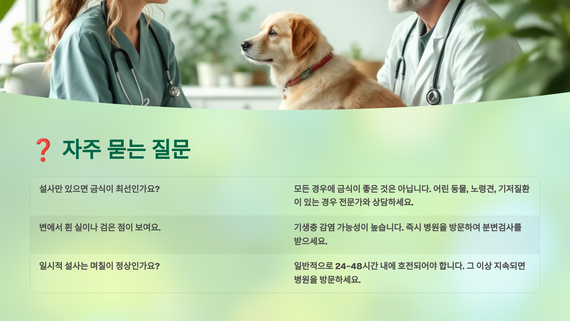 - 지속되는 설사: 24~48시간 이상 설사가 멈추지 않거나 오히려 악화되는 경우 (특히 어린/노령 반려동물).