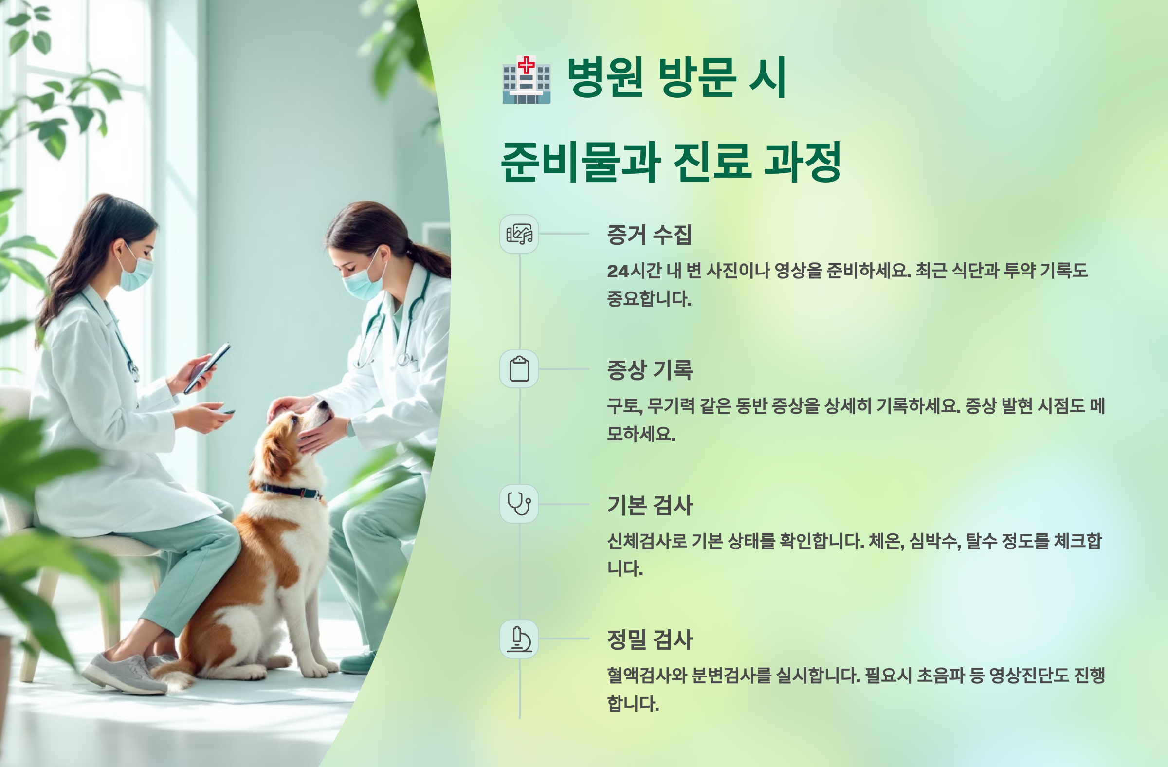 보호자가 이러한 정보들을 미리 파악하여 수의사에게 정확하게 설명해 준다면, 더욱 빠르고 정확한 진단과 치료에 큰 도움이 될 수 있습니다. 🩺