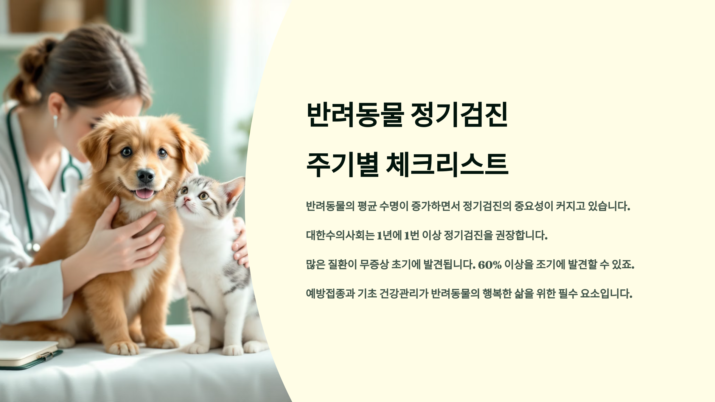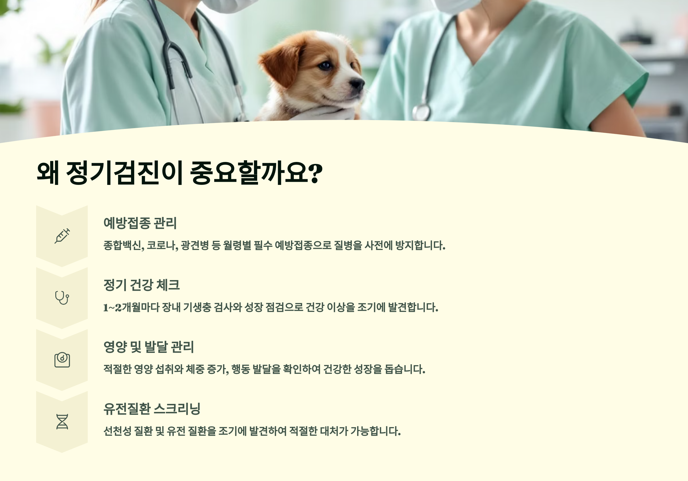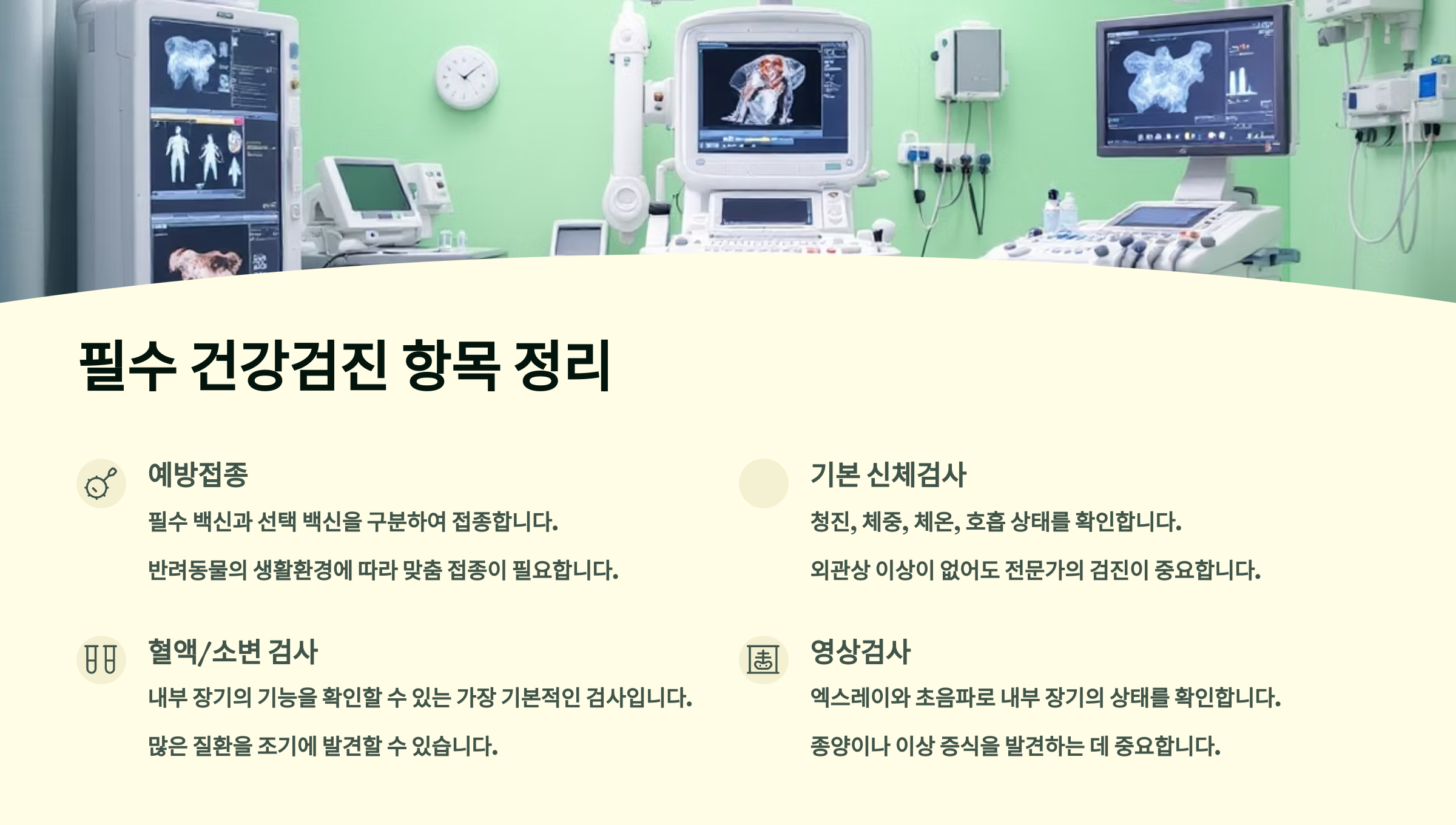사람처럼 반려동물도 정기적인 건강검진이 꼭 필요해요. 특히 아이들이 아픔을 잘 표현하지 못하기 때문에 겉으로는 멀쩡해 보여도 속에서 병이 자라고 있는 경우가 많아요. 그래서 연령대별로 검진을 미리 챙겨주는 게 정말 중요하답니다. 🐾