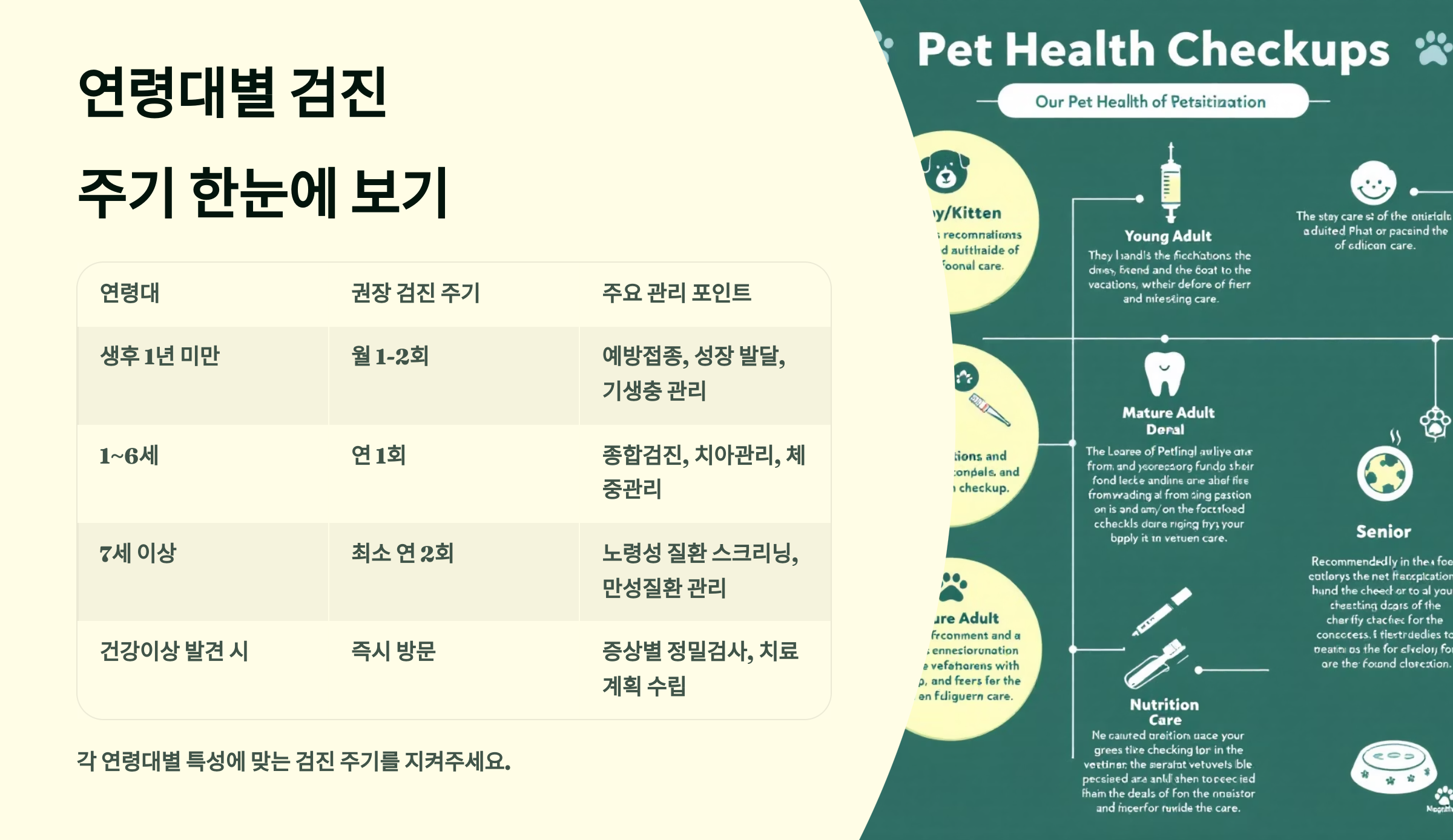 생후 2개월~12개월은 접종, 기생충, 성장점검이 중요하고 1~6세에는 생활습관에서 비롯되는 치석, 비만, 알러지 문제가 많아져요. 7세 이후엔 만성질환 대비를 위한 정밀검사가 핵심이죠. 🧓