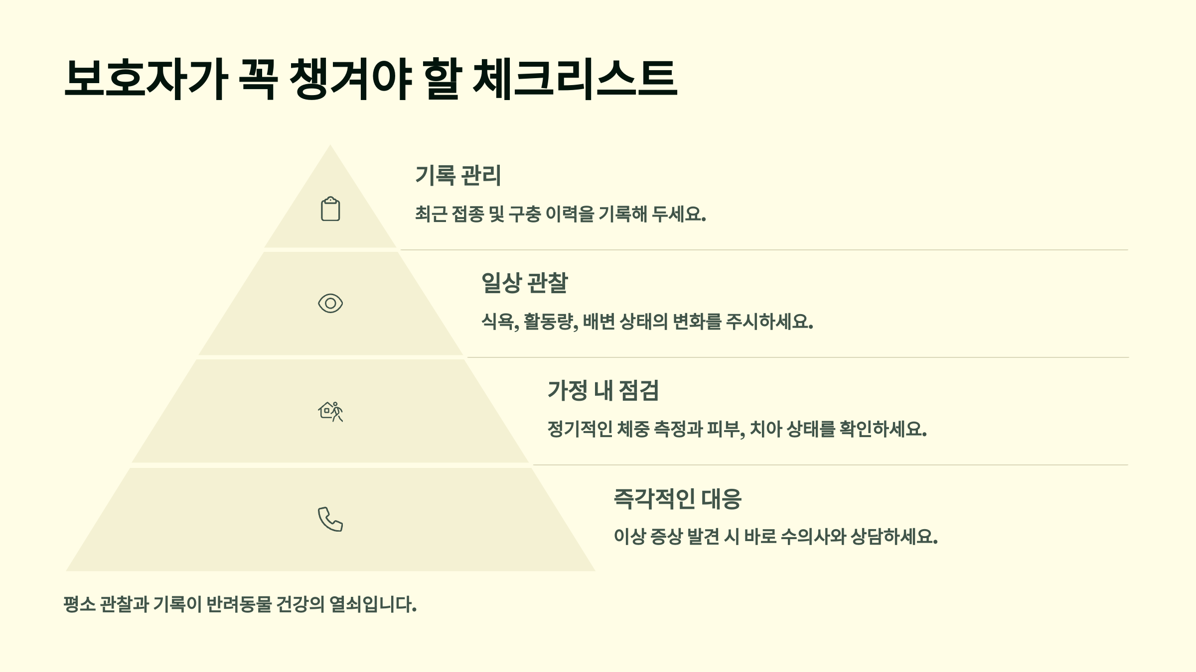 다음은 보호자 입장에서 꼭 체크해야 할 실천 리스트를 생활 루틴 형태로 정리해드릴게요! 📝🐶🐱