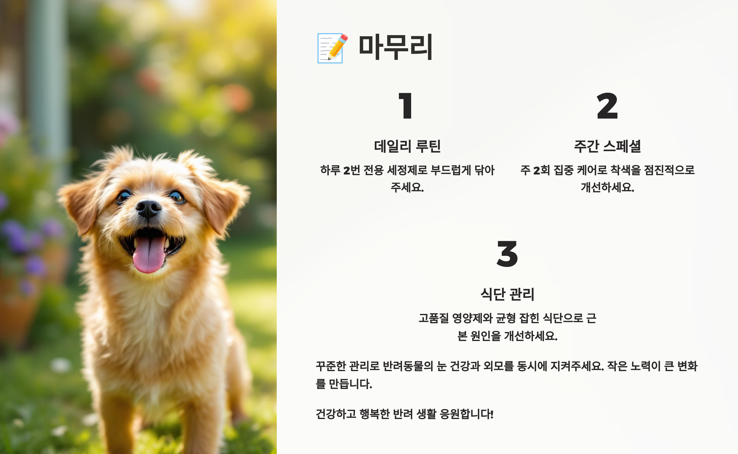 내가 생각했을 때, 이건 단순한 미용이 아니라, 보호자가 아이의 얼굴을 매일 살피고 보살피는 과정이에요. 그 하루 3분의 관리가 곧 우리 아이에 대한 사랑과 책임감의 표현이죠. 💕