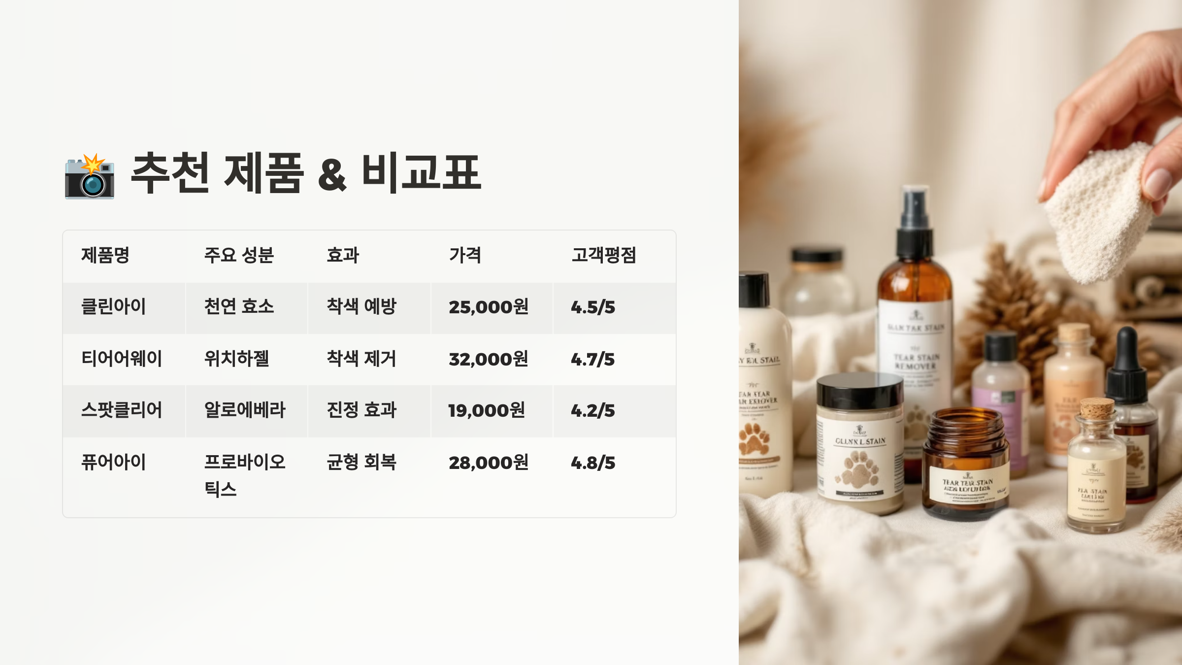 시중에는 눈물자국 관리 제품이 많지만, 성분과 용도, 효과를 기준으로 고르는 게 중요해요. 다음 표는 2025년 기준 보호자들 사이에서 평이 좋은 제품들을 모아서 정리한 비교표예요. 📊