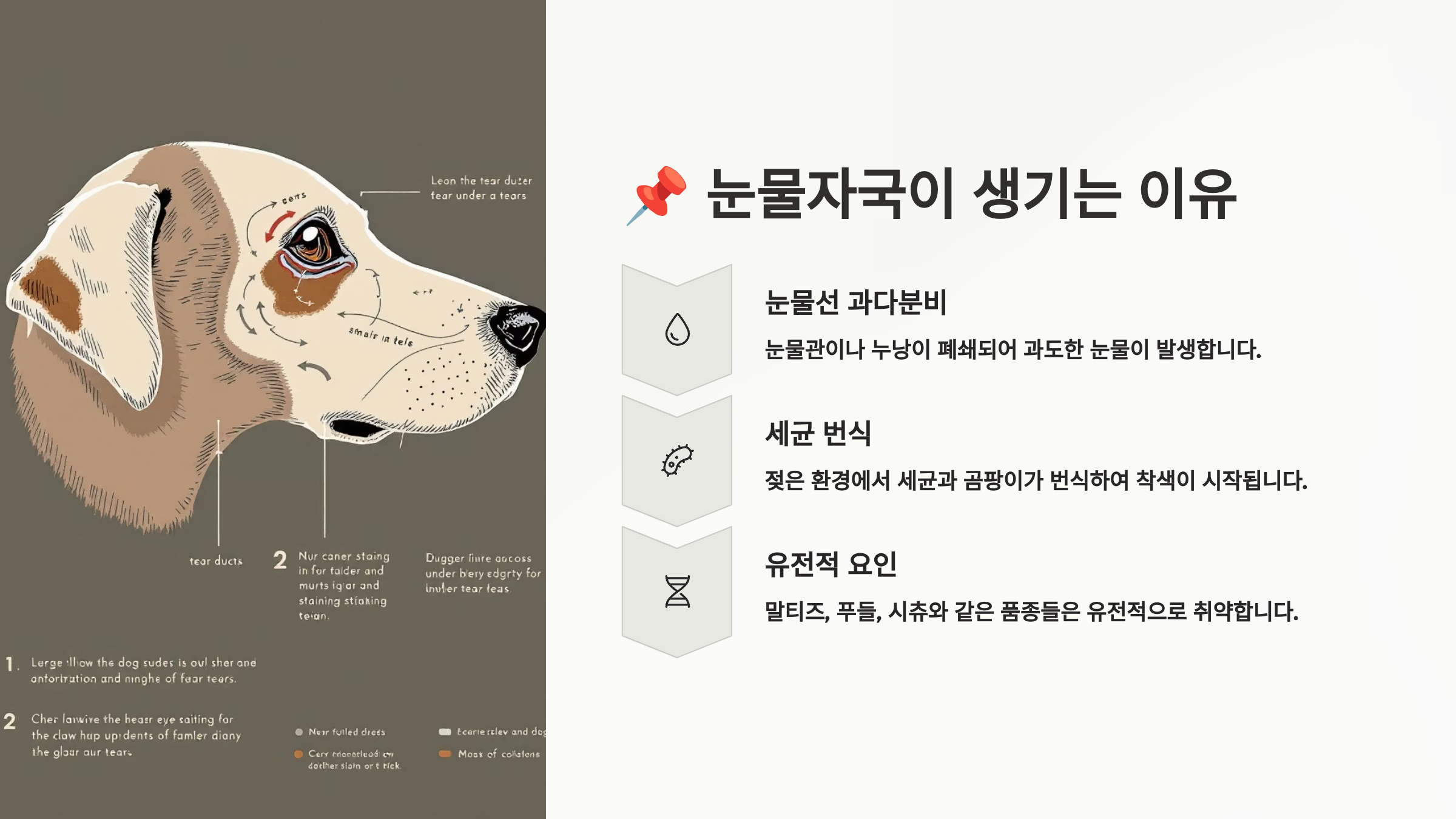 보통 하얀 털을 가진 반려동물에게 눈에 띄게 드러나고, 눈물 배출이 원활하지 않은 단두종(푸들, 말티즈, 페르시안 등)에게 자주 나타나요. 특히 눈물관 막힘, 알레르기, 사료 성분, 물의 질까지 영향을 줄 수 있어요. 🧬