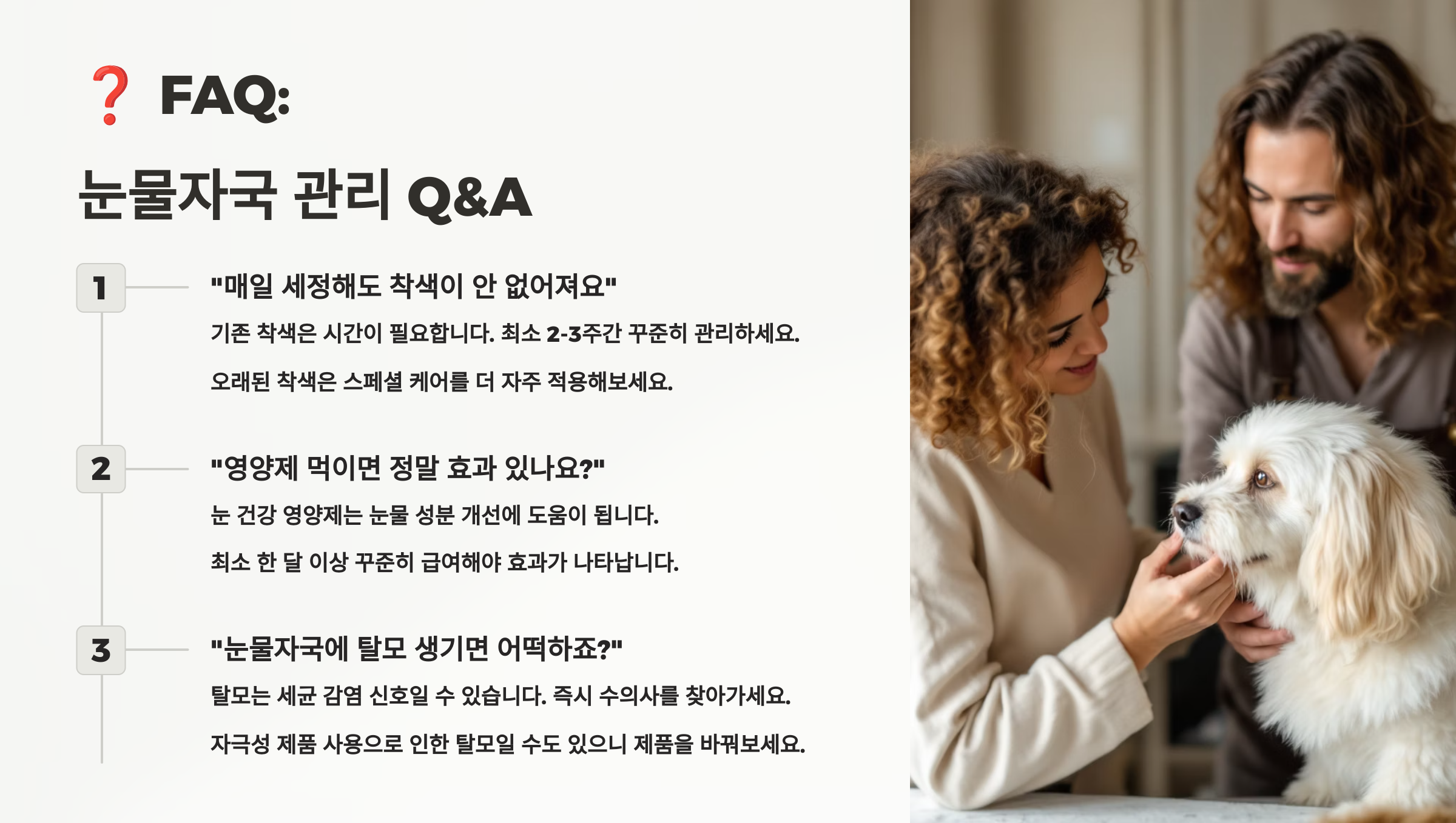 이제 보호자들이 가장 많이 물어보는 눈물자국 루틴 관련 FAQ 8가지를 정리해줄게! ❓🐶😺