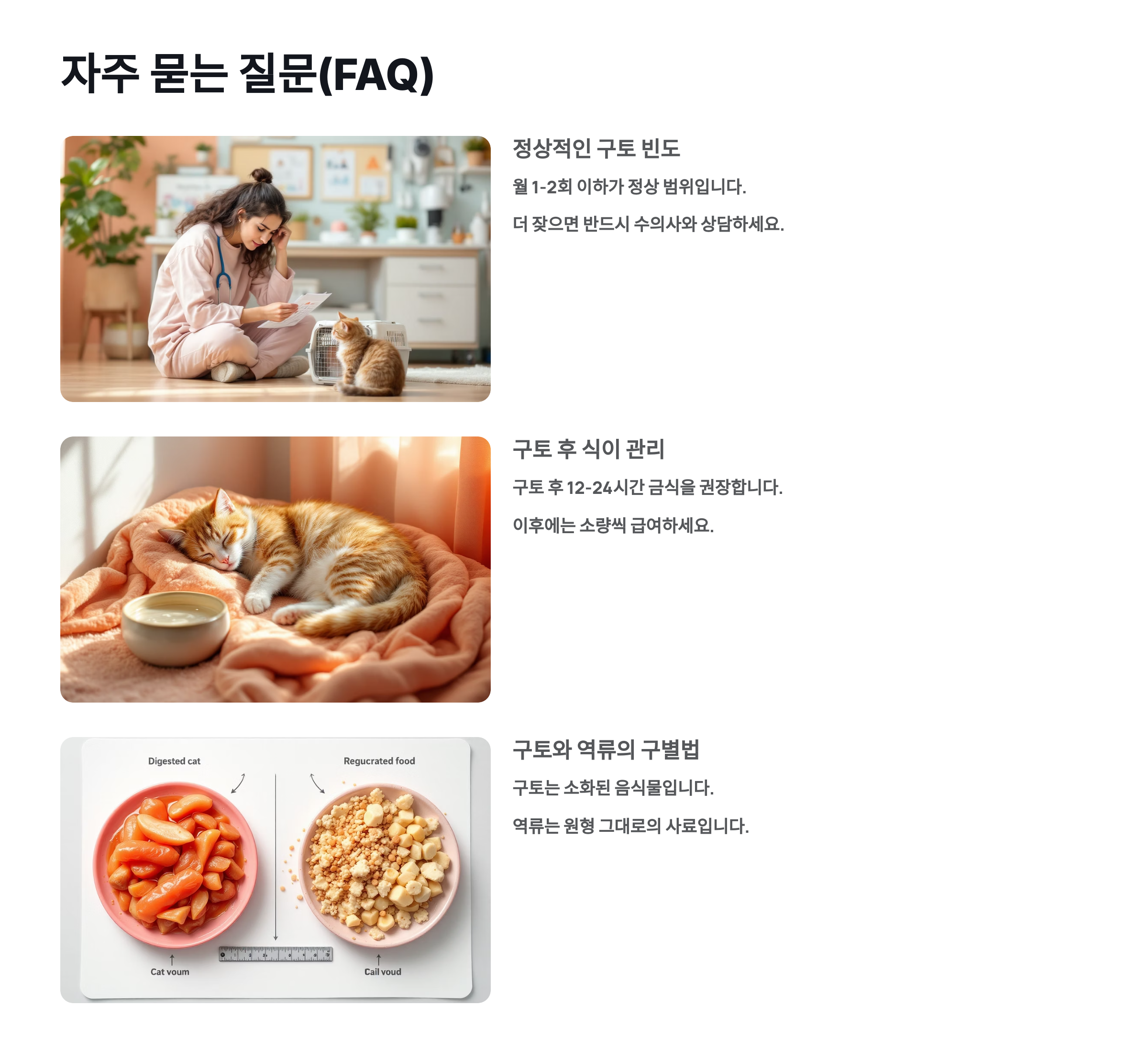😻 아주 사소한 변화가 고양이의 식사 만족도와 건강에 큰 영향을 줄 수 있어요. 오늘 소개한 방법들 중 하나만 실천해도 구토 빈도는 확연히 줄어들 수 있으니 꼭 시도해보세요! 이제 다음 섹션에서는 고양이 구토에 대해 자주 묻는 질문들을 모아 FAQ로 정리해드릴게요! ❓