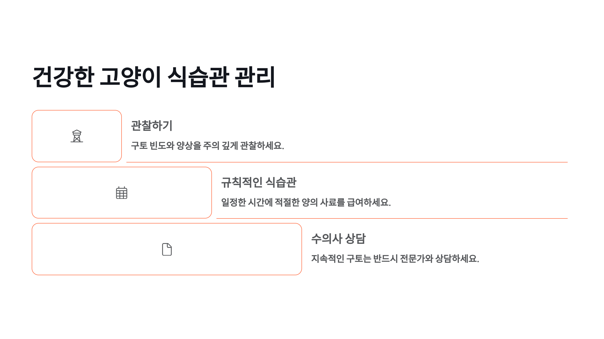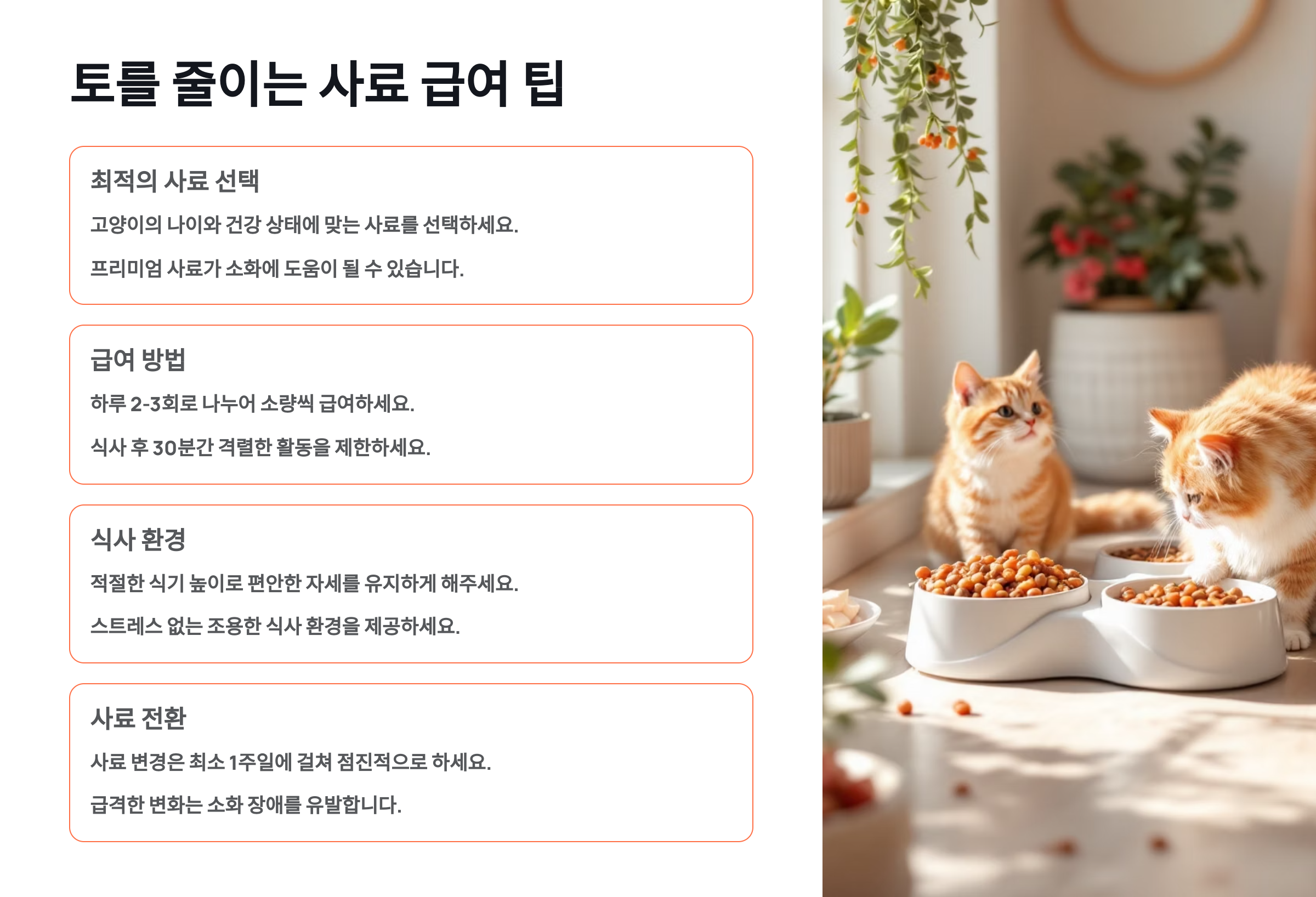 😿 구토는 단순한 행동이 아니라, 고양이 몸속에서 보내는 SOS 신호일 수 있어요. 특히 반복적인 구토가 지속된다면 반드시 건강 상태를 점검해줘야 해요. 다음 섹션에서는 사료 급여 방식만 바꿔도 구토를 줄일 수 있는 팁들을 소개할게요! 🧾🍽️