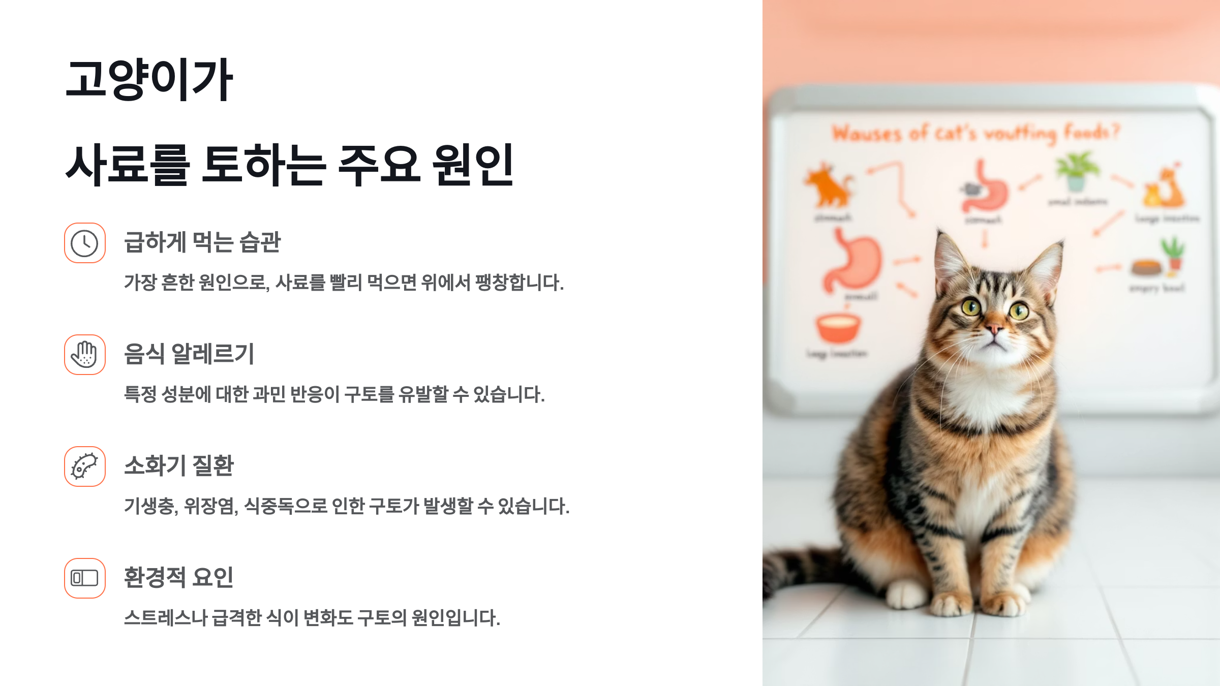 🧫 그 외에도 헤어볼, 알레르기, 위염, 췌장염, 신장질환, 음식 불내증 등도 원인이 될 수 있어요. 이 중 일부는 단순한 식사 습관 문제가 아니라 건강 상태의 이상을 의미할 수도 있어서, 집사의 세심한 관찰이 필요해요.