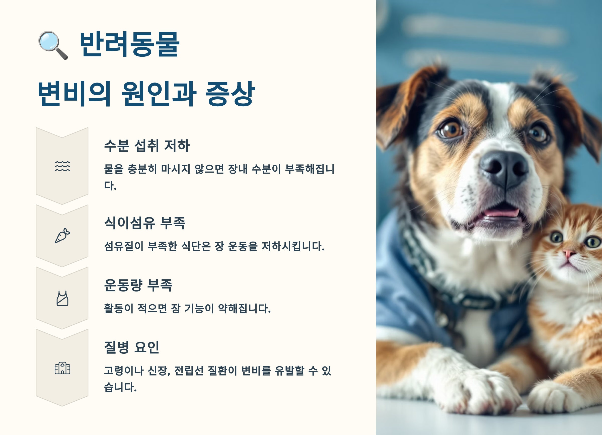 반려동물의 변비는 생각보다 흔하게 발생하는 문제예요. 특히 실내에서만 생활하거나 운동량이 부족한 반려동물들에게 자주 나타나는 증상이랍니다. 사료만 먹이거나 수분 섭취가 부족할 때, 또는 스트레스를 받을 때도 변비가 생길 수 있어요. 심한 경우에는 며칠 동안 배변을 하지 못해서 건강에 심각한 문제를 일으킬 수도 있답니다.