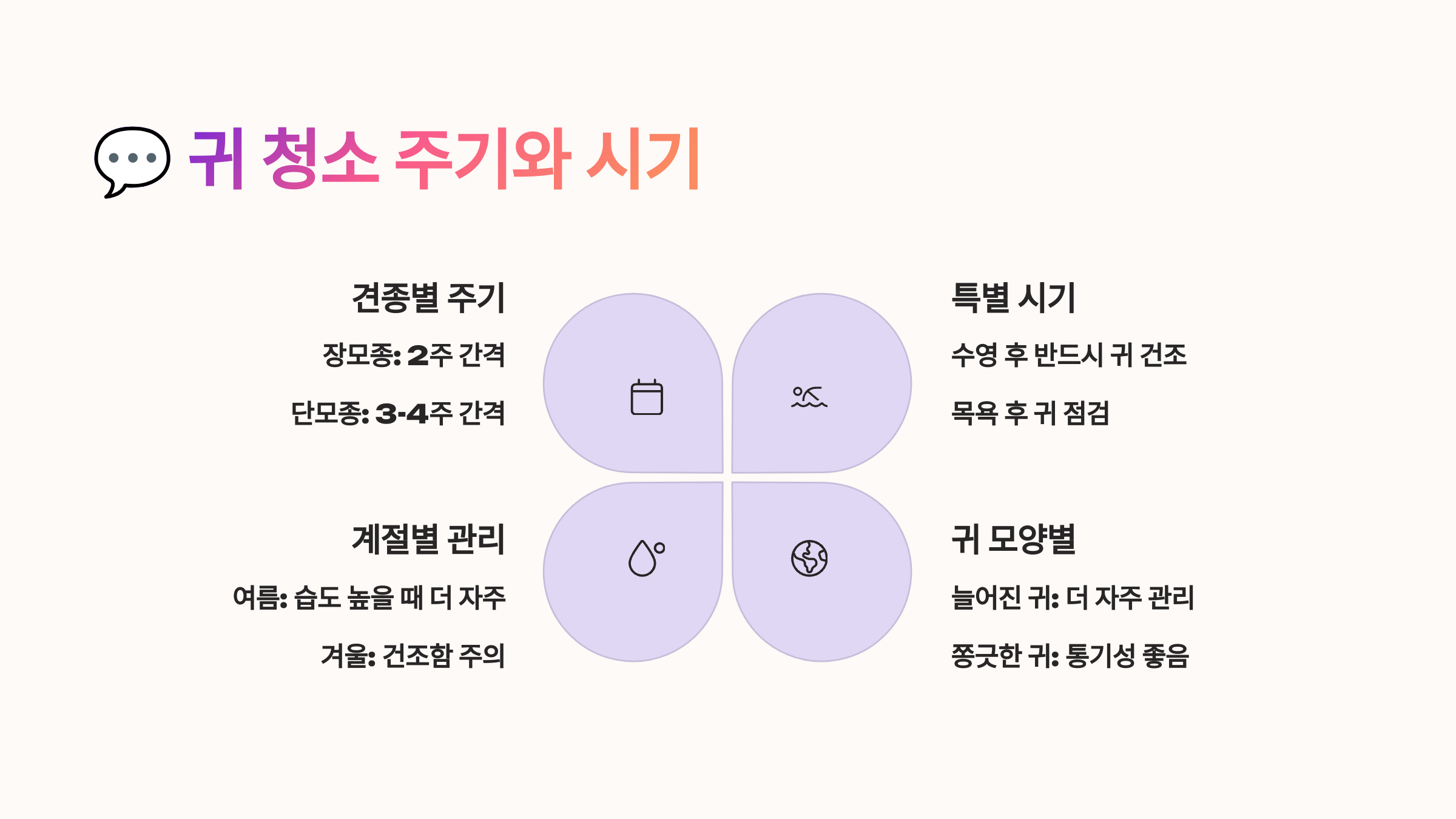 | 귀가 서 있는 품종 (예: 시바, 진돗개) | 2주 1회 | 자연 통풍 유리 |