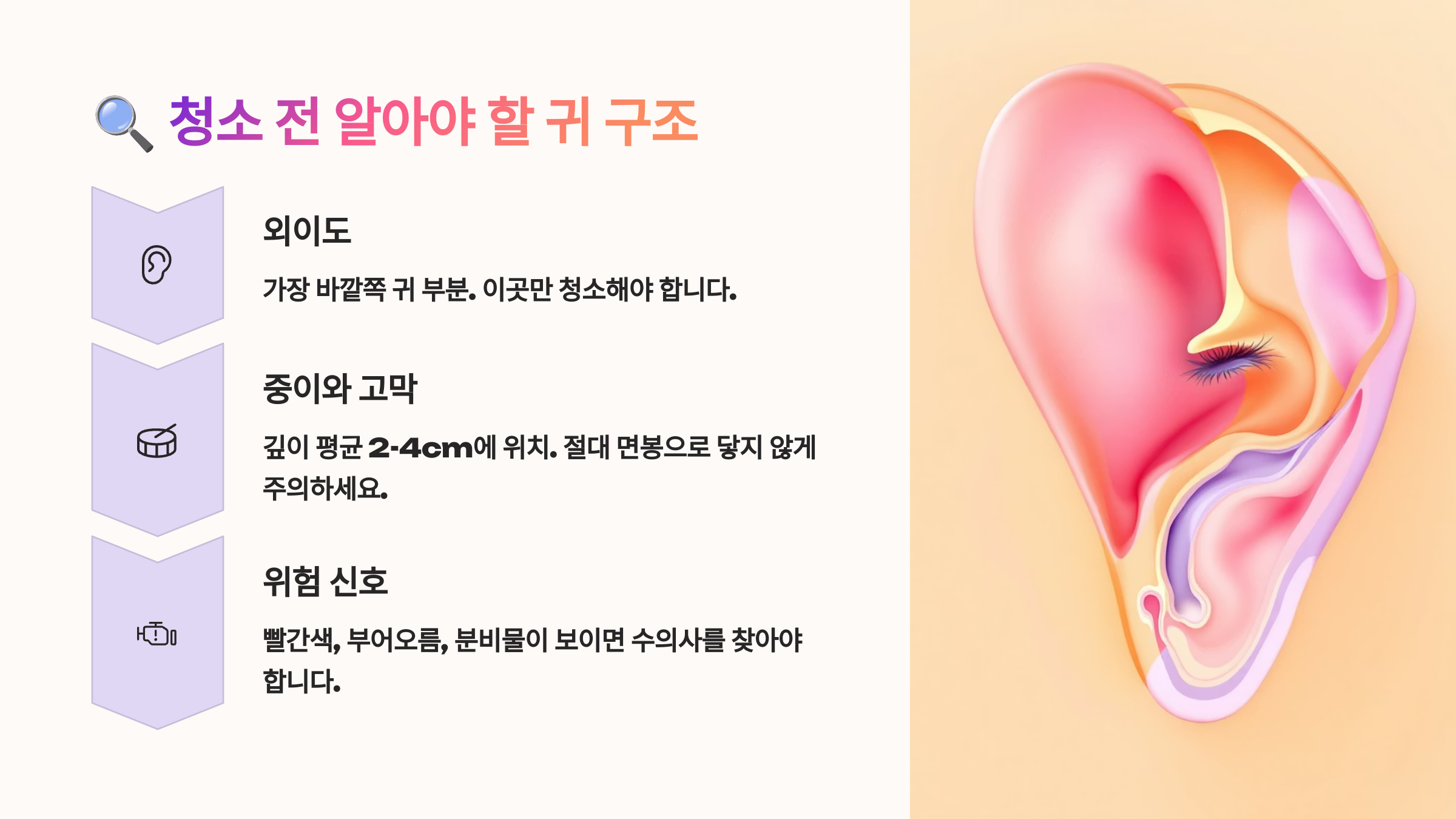 또한 귀 안쪽에는 청각기관, 평형기관이 있으므로 절대 면봉이나 기구를 깊숙이 넣어선 안 돼요! 귓구멍 초입까지만 안전하게 관리하는 게 핵심이에요. ⚠️